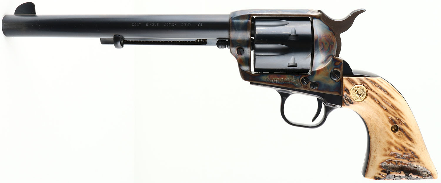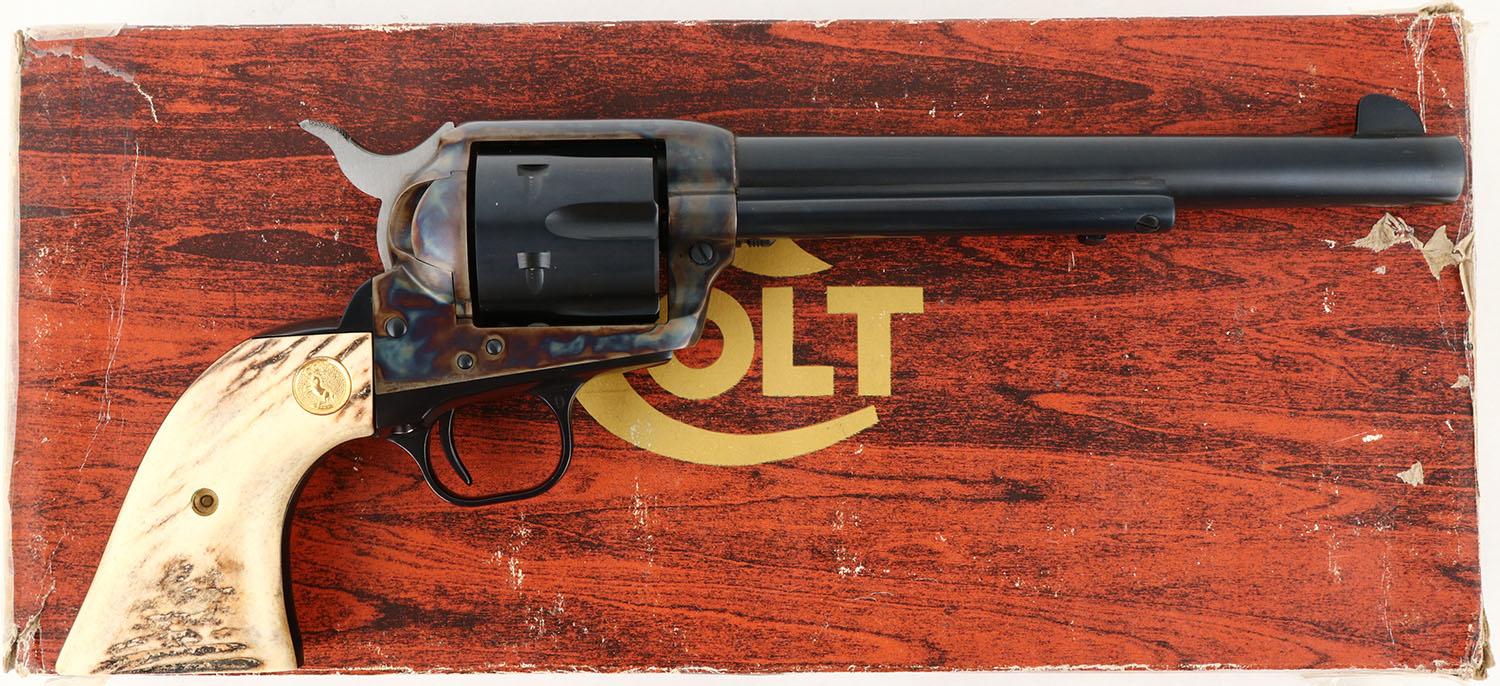 BOXED Colt, Single Action Army (P1870), CAL: .45 COLT, MFG: 1978-93, SN: SA11751. Single Action Revolver, 7 1/2'' barrel. The top of the barrel is marked ''COLT'S PT F.A. MFG. CO. HARTFORD CT. U.S.A.'', The left side of the barrel is marked ''COLT SINGLE ACTION ARMY 45''. The left side of the frame is marked with the Rampant Colt logo above the trigger guard & next to patent dates. The full SN can be found on the frame. The fantastic original stag & gold Rampant Colt medallion grips are excellent. The factory metal blue finishes rates 99%. The case-hardened frame displays vivid case-colors. Bore is excellent & bright. The barrel holds a blade front sight. Comes in the original factory wood grain box, with unopened original documents. Box has tape repairs on the ends. FFL Req. - Value: 1500 to 2500
