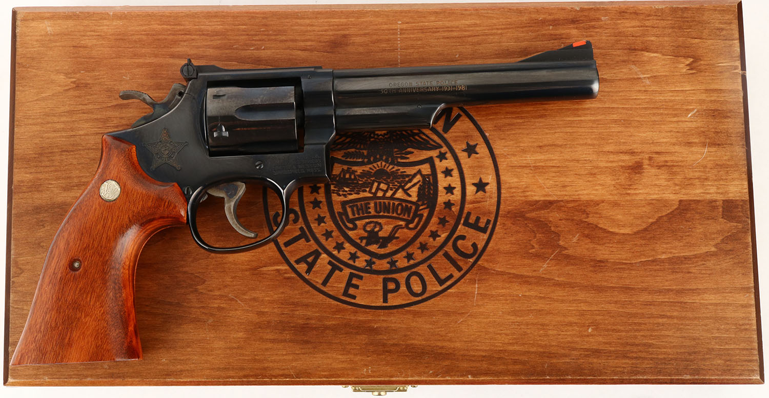 CASED, Smith & Wesson, Model 19-4 Oregon State Police 50th Anniversary Edition, CAL: 357 MAG, MFG: 1981, SN: 66K6132, Double Action Revolver, 5 7/8'' barrel. The S&W logo medallion wood grips are excellent. The high gloss finish is excellent. The right side of the frame is marked with the OSP badge & the right side of the barrel is marked in two lines ''OREGON STATE POLICE 50TH ANNIVERSARY 1931-1981''. The metal blue finish rates 99% overall. The case-hardened trigger & hammer retain vivid case-colors. Bore is excellent. The frame holds an adjustable rear sight & serrated blade front sight with orange insert. Comes in OSP presentation case, with related paperwork. FFL Req. - Value: 600 to 1000