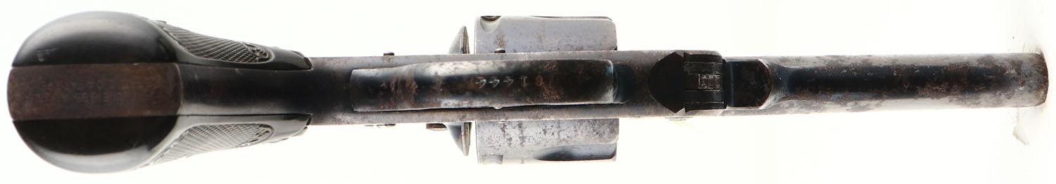 Iver Johnson, Large Frame Safety Automatic Hammerless, Second Model, CAL: 32, MFG: 1893-1900, SN: 61444, Double Action Revolver, 4'' barrel. The Owl logo, checkered hard rubber grips are excellent, with minor handling marks. The metal blue finish is a mix of remaining original blue, brown patina & areas worn to metal grey, with consistent spotting & pitting. Bore is excellent & bright, with intermittent roughness & pitting. The barrel holds a half-moon blade front sight & fixed notch rear sight. FFL or C&R Req. - Value: 100 to 300