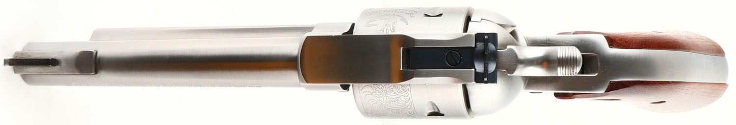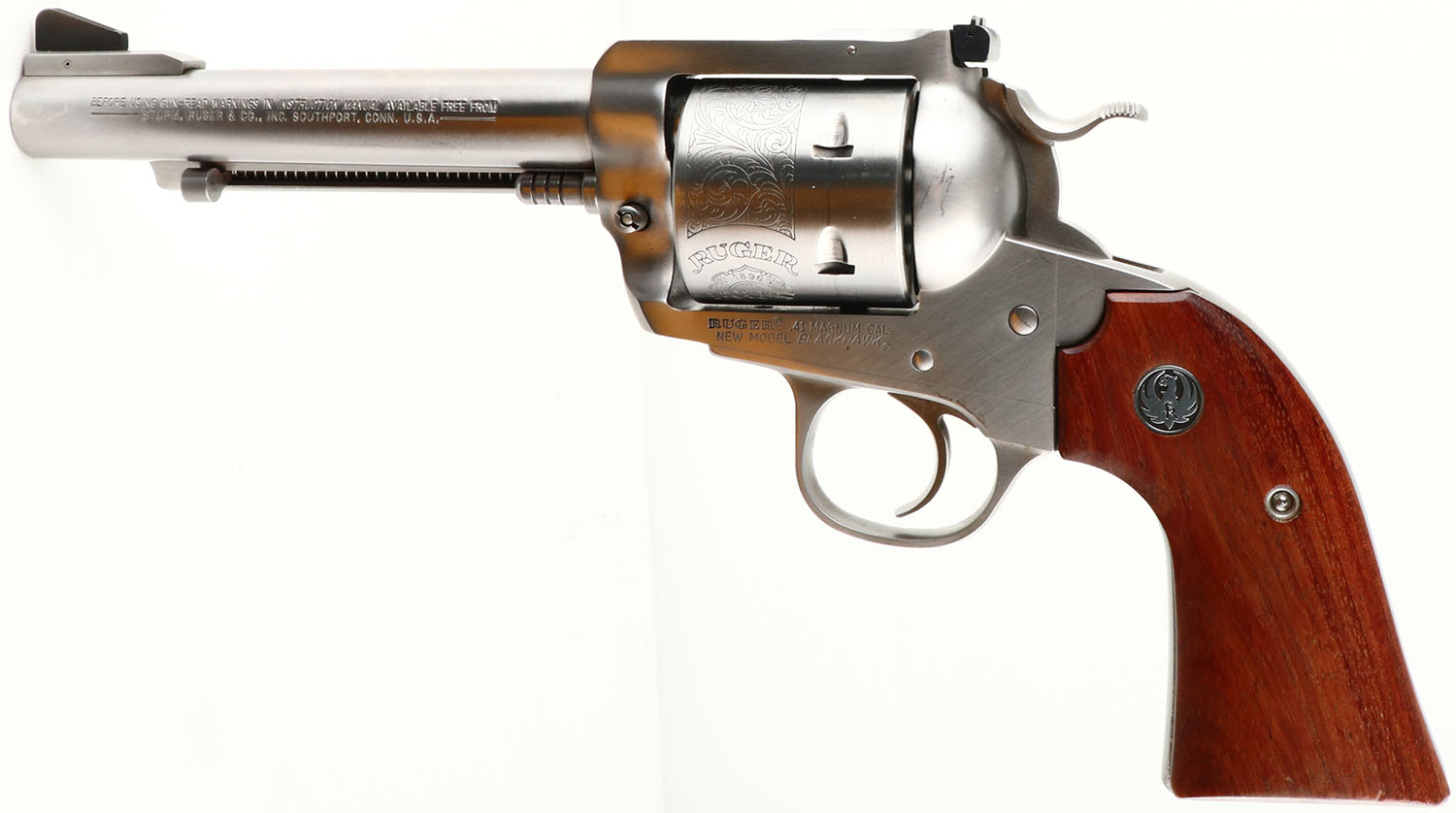 BOXED, Ruger, New Model Blackhawk, Bisley Model. CAL: 41 MAG, MFG: 2003, SN: 48-20745, Single Action Revolver, 4 3/4'' barrel. The Ruger logo medallion wood grips are excellent, with a few tiny handling marks or scratches. The polished stainless steel finish is excellent, near mint. Bore is excellent. Ruger Bisley Model floral roll stamped cylinder. Factory sights. Comes in original box. This is an excellent overall, near new old stock condition revolver from gun shop inventory. FFL Req. - Value: 500 to 1000