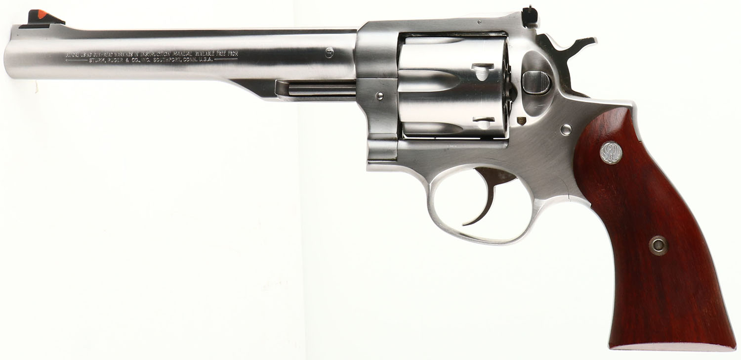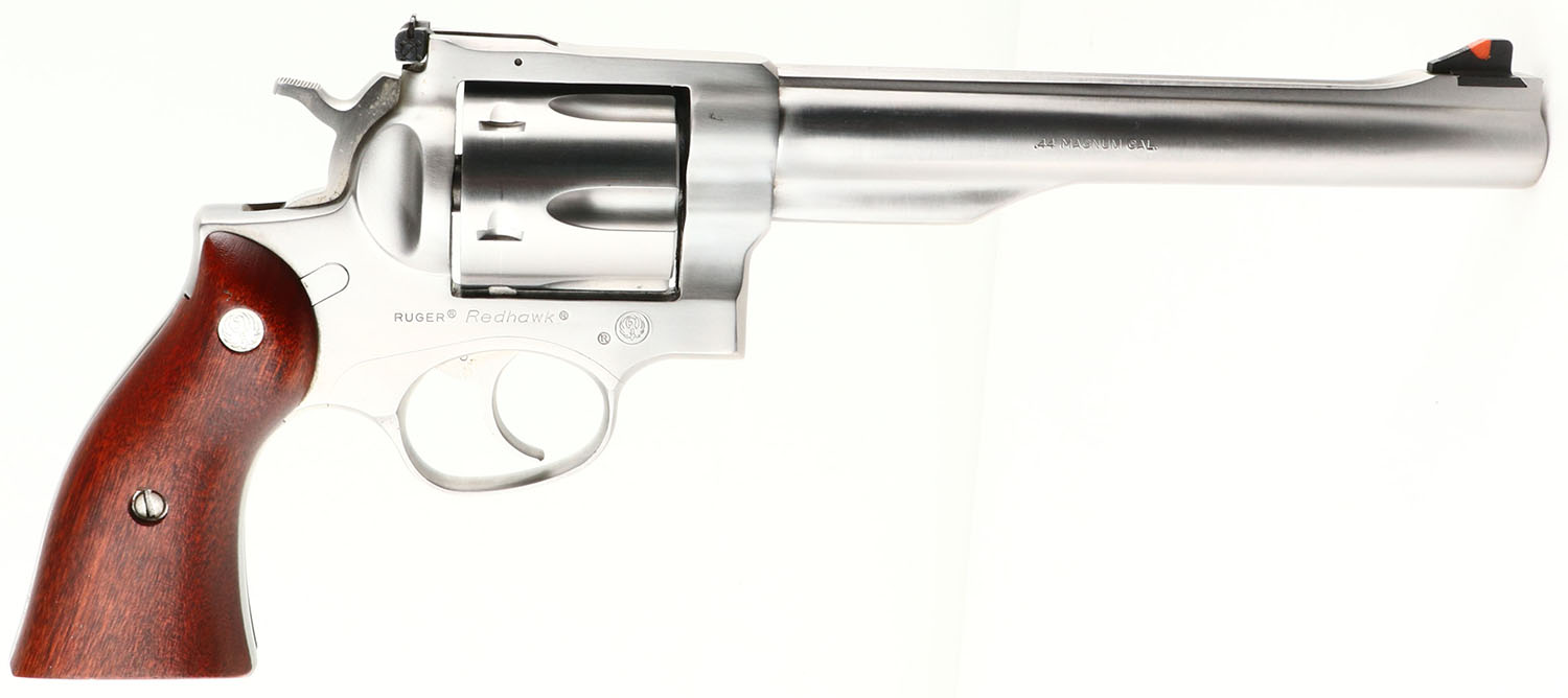 Ruger, Redhawk, CAL: 44MAG, MFG: 1982, SN: 500-15215, Double Action Revolver, 7 1/2'' barrel. The Ruger logo medallion wood grips are excellent, with minor handling marks. The stainless steel finish is excellent, with minor handling marks. Bore is excellent. The frame holds an adjustable rear sight & the barrel has a serrated blade front sight, with orange insert. FFL Req. - Value: 600 to 1000