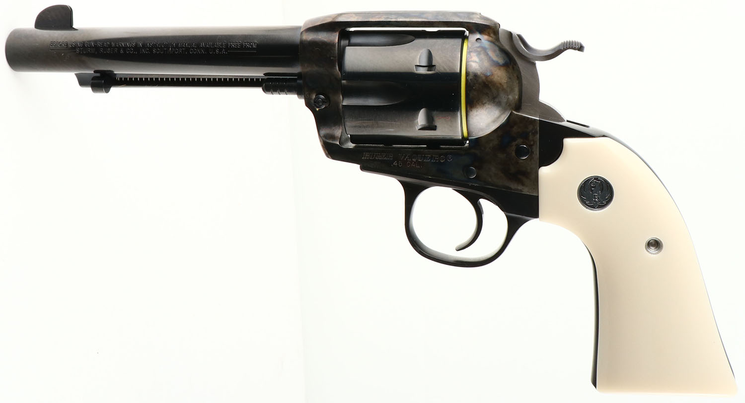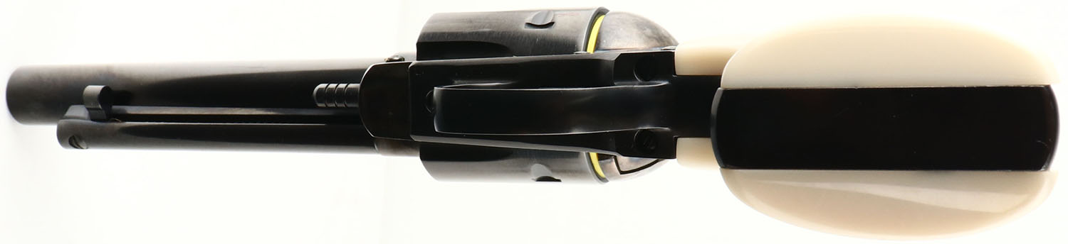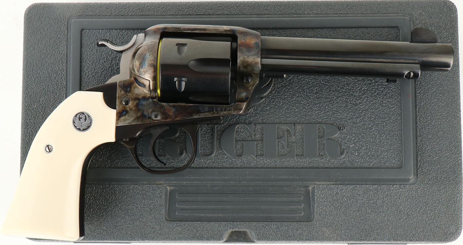 NEW, CASED, Ruger, Vaquero, CAL: 45 Colt, MFG: 2003, SN: 58-18729, Single Action Revolver, 5 1/2'' barrel. The Ruger logo faux ivory grips are excellent. The metal blue finish on the barrel, cylinder & trigger guard is near mint. The frame is case-hardened, retaining full case-colors. Bore is excellent. Barrel holds single front blade. Still has yellow cylinder spacer. Comes in original Ruger grey hard case, with bag & owners manual. NOS gun store inventory. FFL Req. - Value: 500 to 800