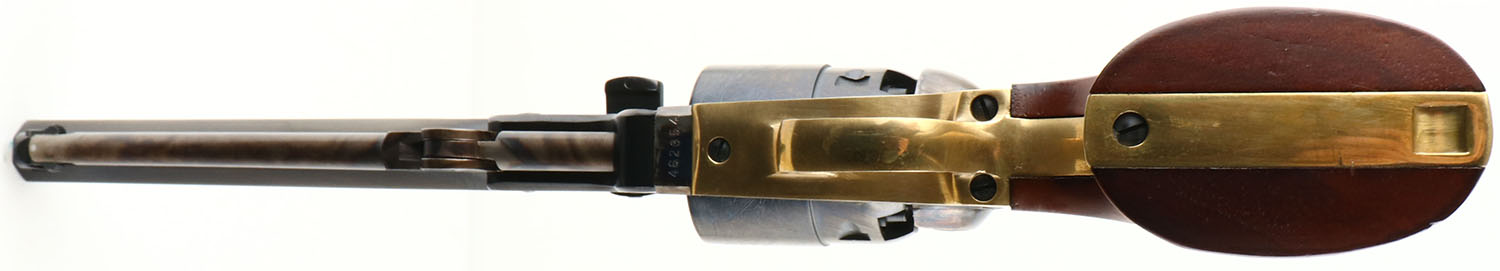 F. LLI Pietta, Model 1851 Navy, CAL: 44, MFG: Modern, SN: 462354, Black Powder Percussion Revolver, 7 1/2'' barrel. The original wood grips are Excellent, with a minor wear from handling. The engraved & blued barrel & cylinder are excellent, The case-hardened frame, trigger & hammer are very good some has started to fade, all having vivid-colors. Bore is excellent. The barrel carries a single post bead. A very nice condition, modern black powder revolve. Black Powder Muzzleloader, No FFL Req - Value: 200 to 400