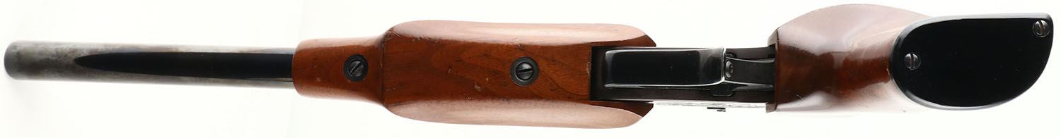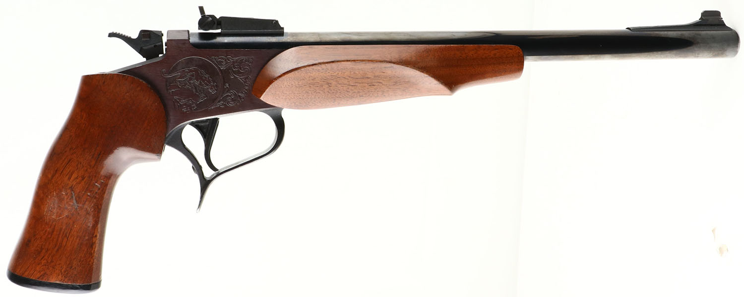 Thompson Center Arms, Model Super 14, CAL: 30-30, MFG: 1967-2000, SN: 124423, Break Action Single Shot Pistol, 14'' barrel. The original factory wood grips are excellent. The original metal finish is 97% with most of the wear at tip of barrel. Features an etched cougar perched on ledge on both sides of receiver. Bore is excellent. Factory sights. FFL Req. - Value: 600 to 1000