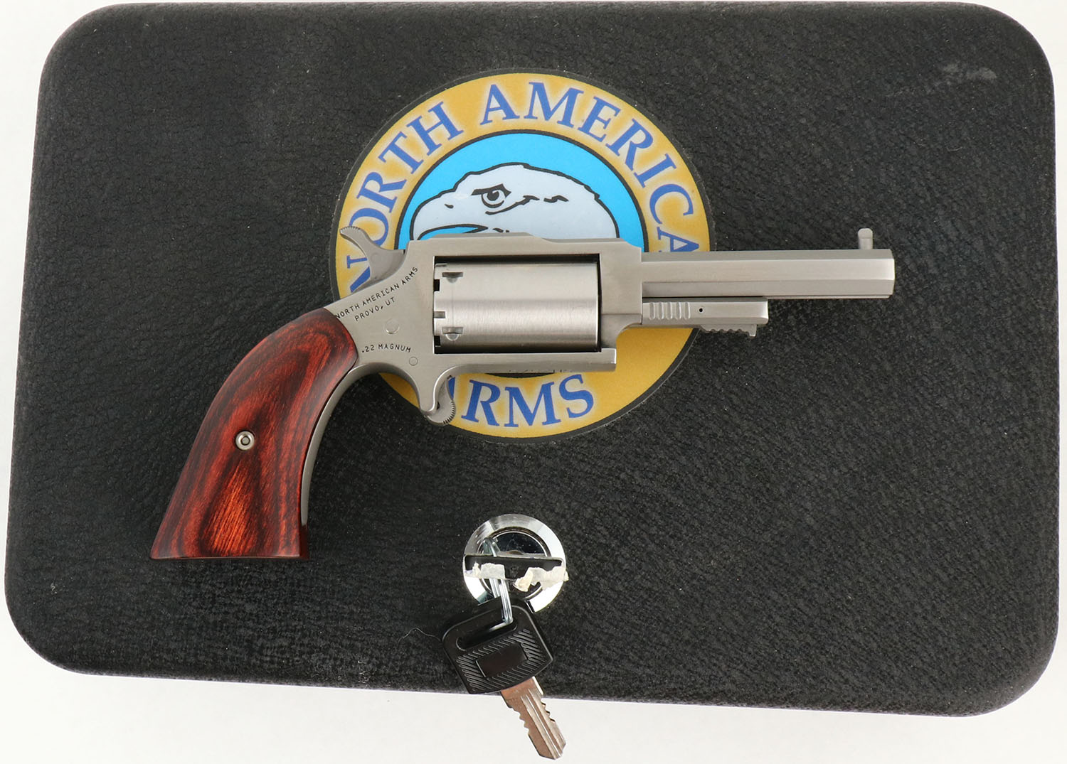 North American Arms, ''The Earl'', CAL: 22 MAG, MFG: Modern, SN: SH2575, Single Action Revolver, 2 1/2'' octagon barrel. The original wood grips are excellent. The stainless steel finish is excellent. Bore is excellent, near mint. The frame has an integrated rear groove & the barrel carries a post front sight. Comes in a lockable hard case, with paperwork & key. FFL Req. - Value: 300 to 400