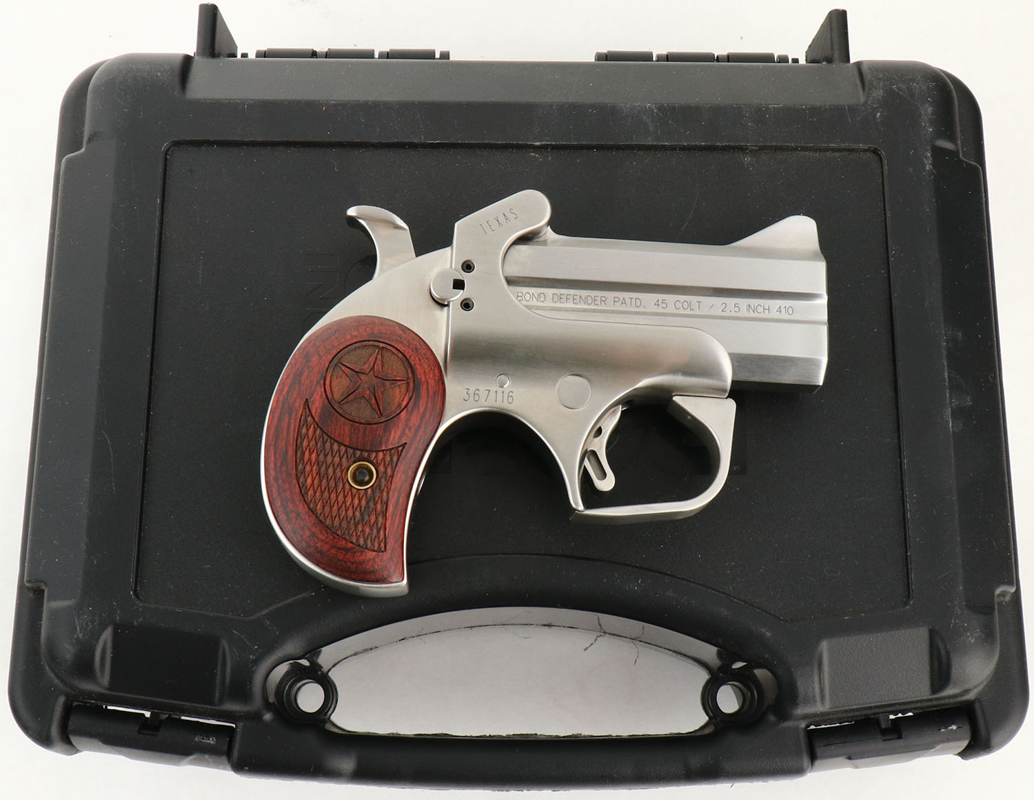 CASED, Bond Arms, Texas Defender, CAL: .410/45 LC, MFG: Modern, SN: 36746, Single Action Revolver, 3'' barrel. The checkered rosewood grips with star emblem are excellent. The stainless steel finish is excellent. Bores are excellent. Fixed notch rear sight & blade front sight. Comes in factory hard case, with paperwork. FFL Req. - Value: 500 to 600