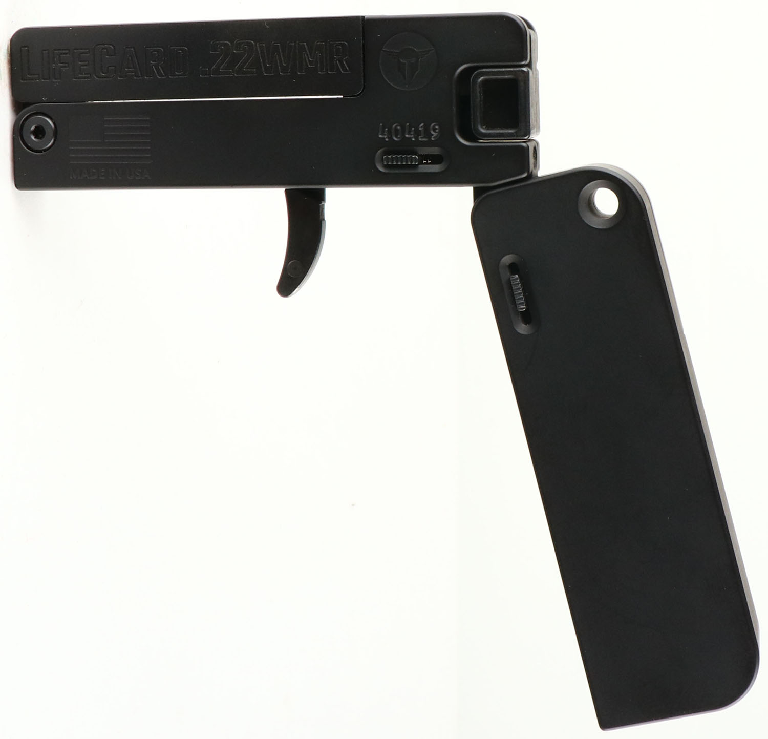 BOXED, Trailblazer Firearms, Lifecard, CAL: 22WMR, MFG: Modern, SN: 40419, Single Shot Pistol, 2 3/8'' barrel. The grip folds out from the bottom. The corrosion resistant matte black finish rates 99%+ overall. Bore is excellent. Integral groove sight. From Trailblazer Firearms: A folding, single-shot .22 caliber pistol that's no bigger than a stack of credit cards. At .5 inches thin and weighing less than 7 ounces, LifeCard will be the last gun you'll leave behind. NOS. FFL Req. - Value: 300 to 400