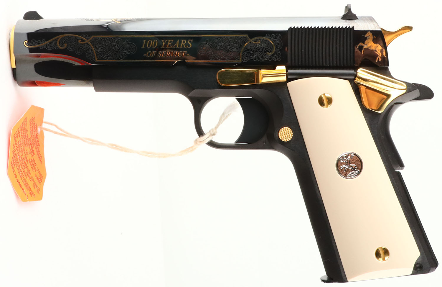 CASED, Colt Government Model Series 80 ''100 Years of Service'' Edition, CAL: 45 AUTO, MFG: 2011, SN: 2844318, Semi Auto Pistol, 4 7/8'' barrel. The silver Colt medallion faux ivory grips are excellent. The metal blue finish on the frame & slide rates 99%+. The gold tone finish on the hammer, safety, slide lock, magazine release, barrel ring & screws is excellent & bright. The left side of the slide displays beautiful ornamental scroll engraving with gold accents, is marked ''100 YEARS OF SERVICE'' in gold tone lettering & has a gold tone Rampant Colt on the back on the slide. The right side of the slide displays the same engravings & accents, with Sam Colt signature & a gold image of the iconic Blue Onion Dome on the back of the slide. The top of the slide displays a gold tone vignette of the Rampant Colt amongst ornamental engraving. Bore is mint. The slide holds white dot sights. Comes in factory hard case, with related paperwork, hang tag, extra mag & lock/key. - Value: 1500 to 2500
