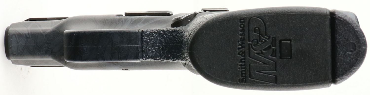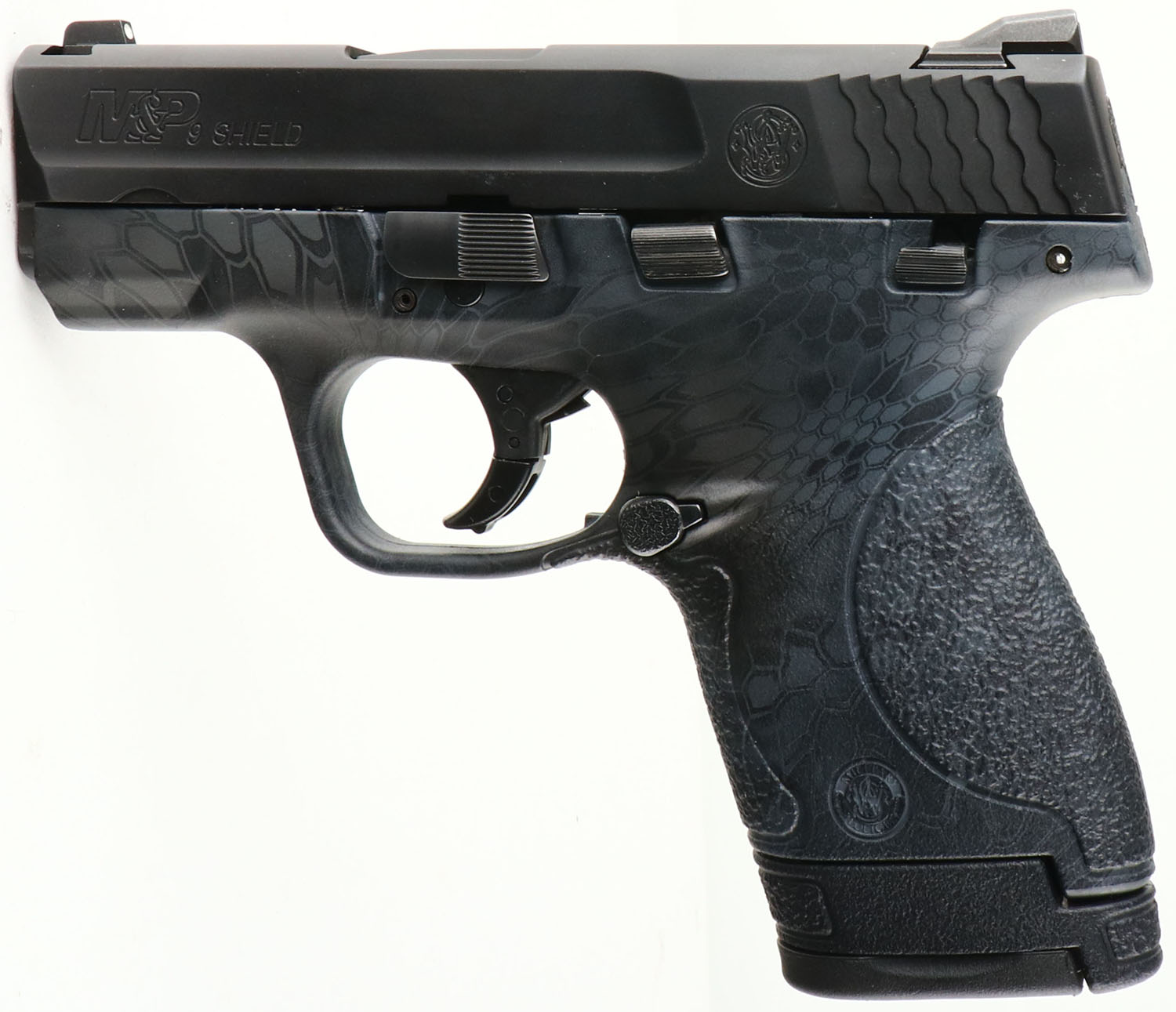 Smith & Wesson, M&P 9 Shield, CAL: 9mm, MFG: Modern, SN: HWJ3915, Semi Auto Rifle, 3'' barrel. The Talo Exclusive Kryptek Typhon Camo textured polymer grip frame is excellent. The matte black finish on the slide rates 99%+. Bore is excellent. Factory sights. A cool variant of the M&P 9 Shield. FFL Req. - Value: 350 to 550