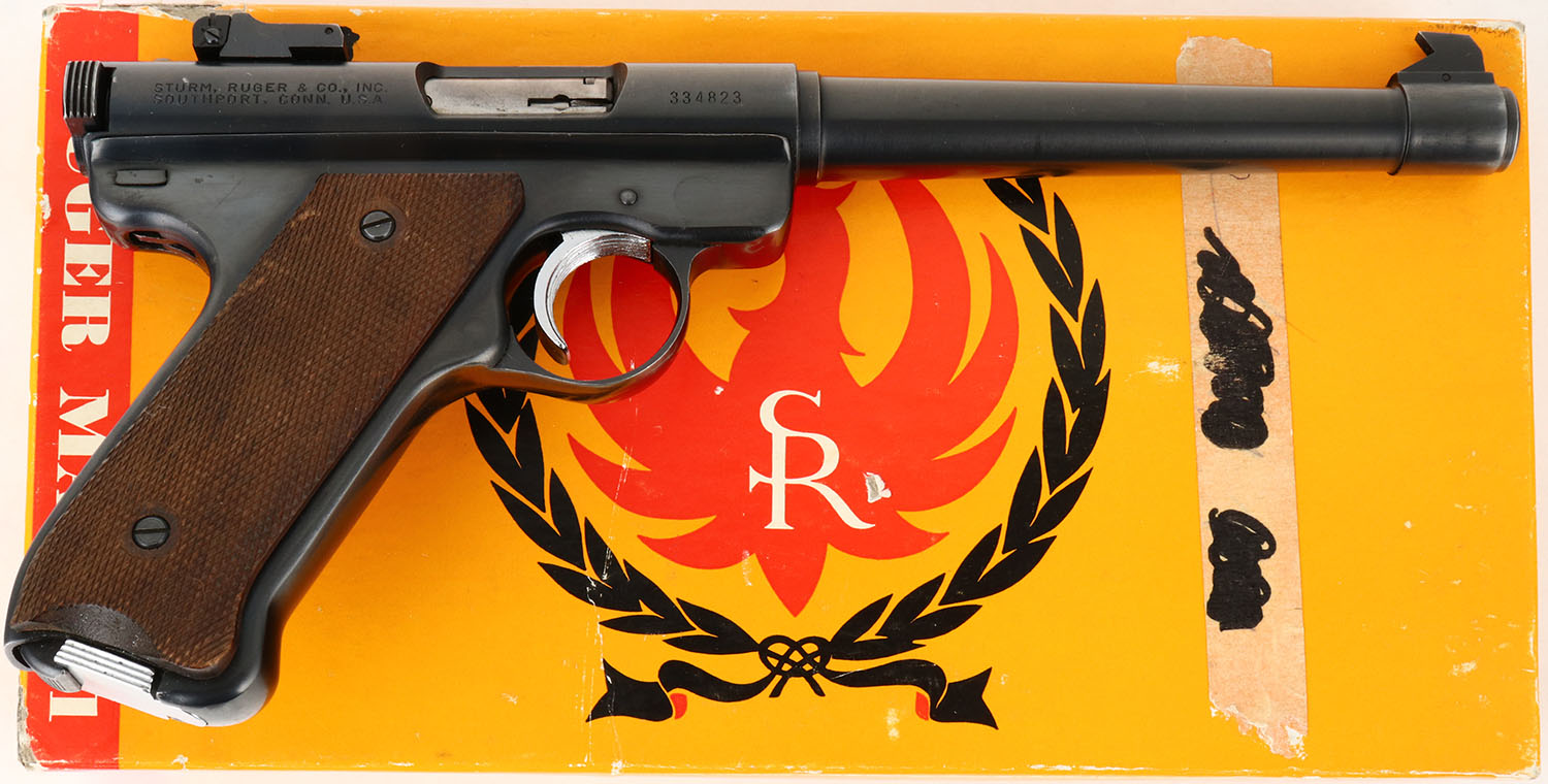 BOXED Ruger, Model Mark I Target, CAL: 22 LR, MFG: 1966, SN: 334823, Semi Auto Pistol, 6 7/8'' barrel. The checkered thumb rest factory walnut grips, with black Ruger Phoenix on a silver background are excellent. The factory metal blue finish rates 99%+ overall. Bore is excellent & bright. The frame holds an adjustable rear sight & Partridge front sight. Comes in the original red & yellow box, with factory booklet & warranty card. FFL or C&R Req. - Value: 500 to 1000