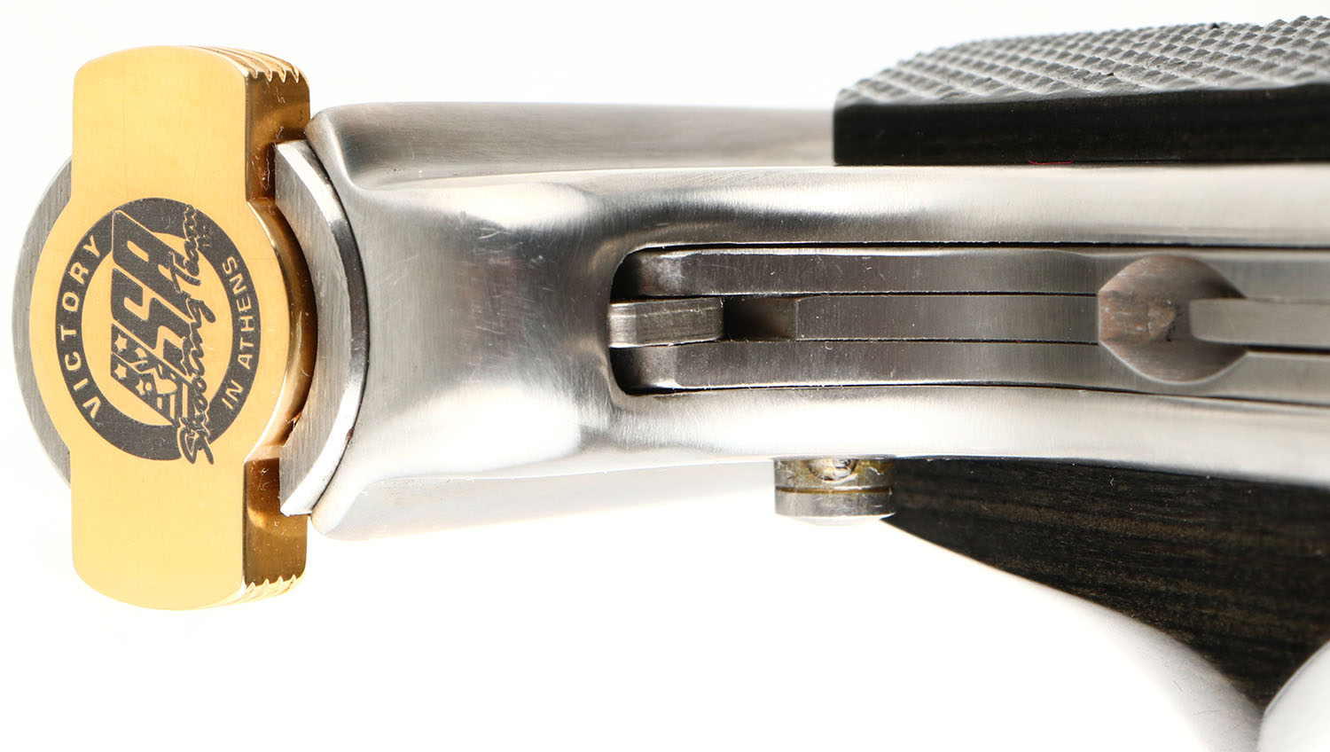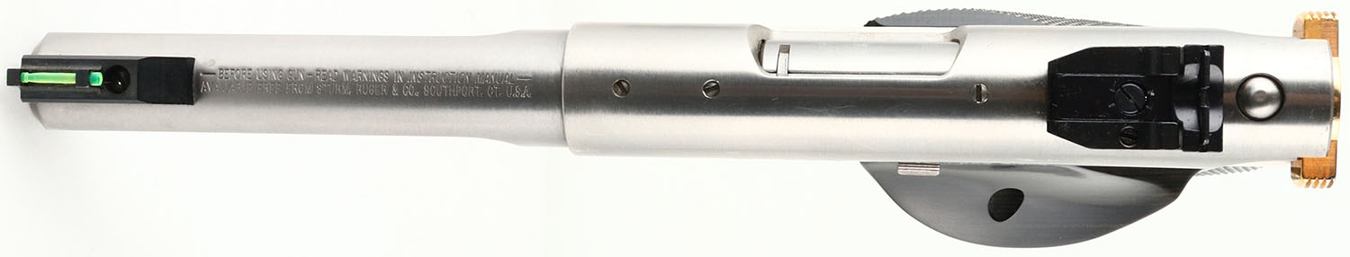 CASED & RARE Ruger, Mark II Target Competition ''U.S. OLYMPIC SHOOTING TEAM'' edition, CAL: 22 LR, MFG: 2004, SN: USA-02246, Semi Auto Pistol, 5 1/2'' Heavy slab sided barrel. 6 R.H. groove/ twist. 1/16'' turns. The checkered thumb rest factory laminated grips, with silver Ruger Phoenix on a red background are mint. The factory stainless steel finish rates 99%+ overall. The gold colored plate on the trigger & rear of bolt rate excellent. Bore is excellent. The pistol features a fiber optic Partridge front sight & adjustable rear sight. It is factory drilled & tapped for mounting optics & the rear of the bolt marked ''USA Shooting Team'' surrounded by ''Victory in Athens''. Comes in the original factory hard case correctly end labeled & numbered to the gun, a pair of magazines, spare Hi-Viz fiber optic inserts, owners manual, paperwork, internal bag & test cartridge. NOS gun store inventory. FFL Req. - Value: 400 to 800