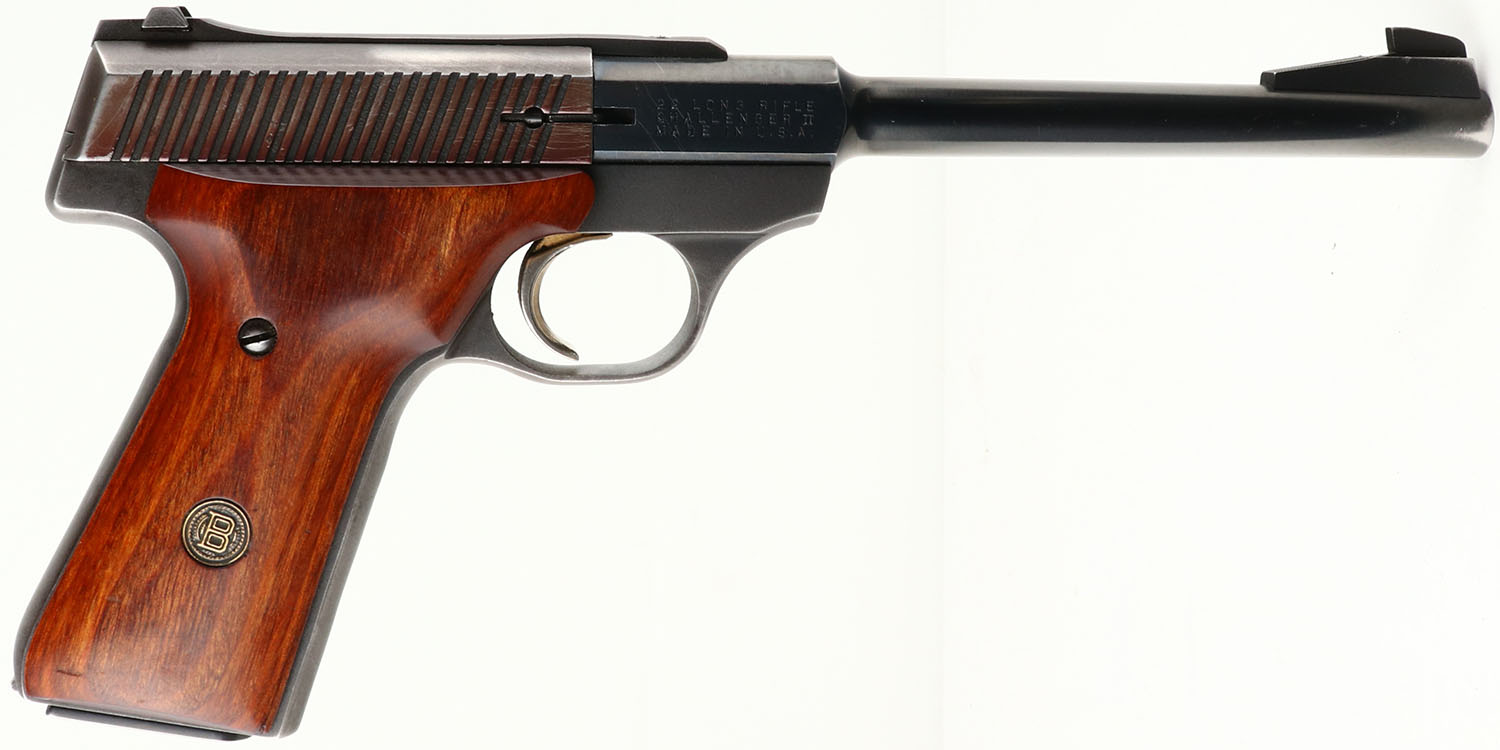 Browning, Challenger II, CAL: 22LR, MFG: 1980, SN: 655PM03292, Semi Auto Pistol, 6 3/4'' barrel. The Browning brass medallion wood grips are excellent, with handling marks & multiple light scuffs. The metal blue finish rates 95%. The slide is toned plum. Gold tone trigger. Bore is excellent. The slide carries an elevated rear sight & the barrel has a serrated ramp elevated blade front sight. Comes with a Bianchi 22 Auto leather holster. FFL or C&R Req. - Value: 300 to 600