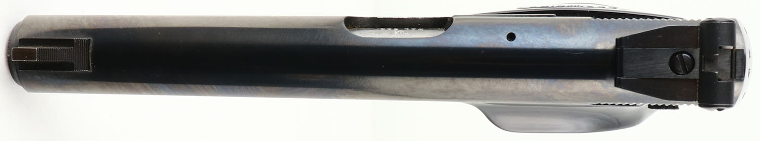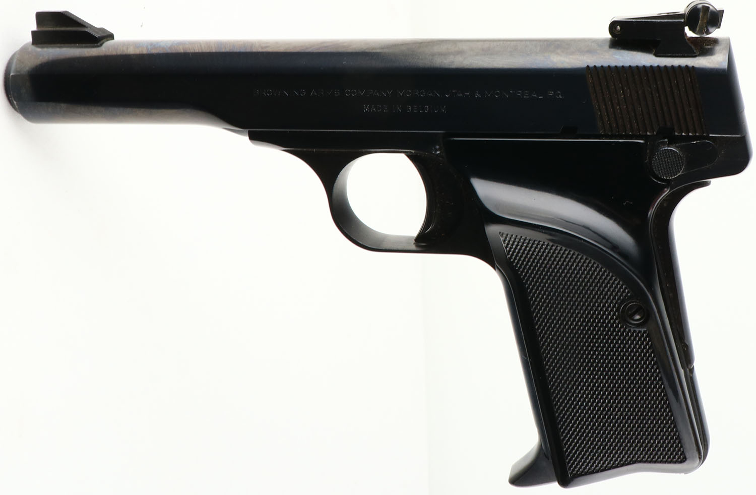 Browning (Belgium) Model 10/71, CAL: 380, MFG: 1971-74, SN: 71N02185, Semi Auto pistol, 4 3/8'' barrel. The Browning marked plastic checkered grips are excellent with light surface wear to edges. The polished metal blue finish rates 98%. Bore is excellent. The slide carries an adjustable rear & fixed front sight. Has (1) 6 round mag. Comes with a black Browning soft case. FFL Req. - Value: 400 to 800
