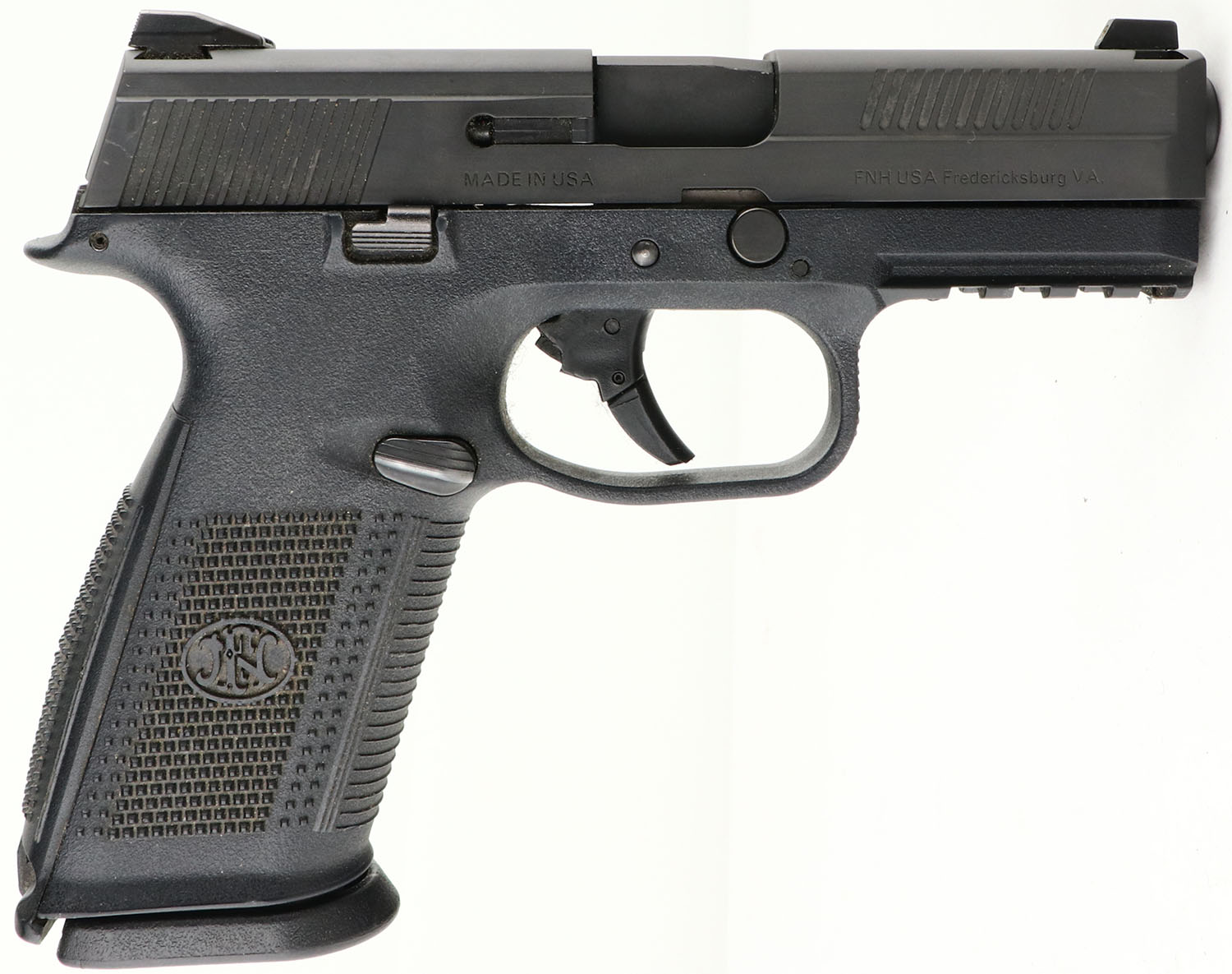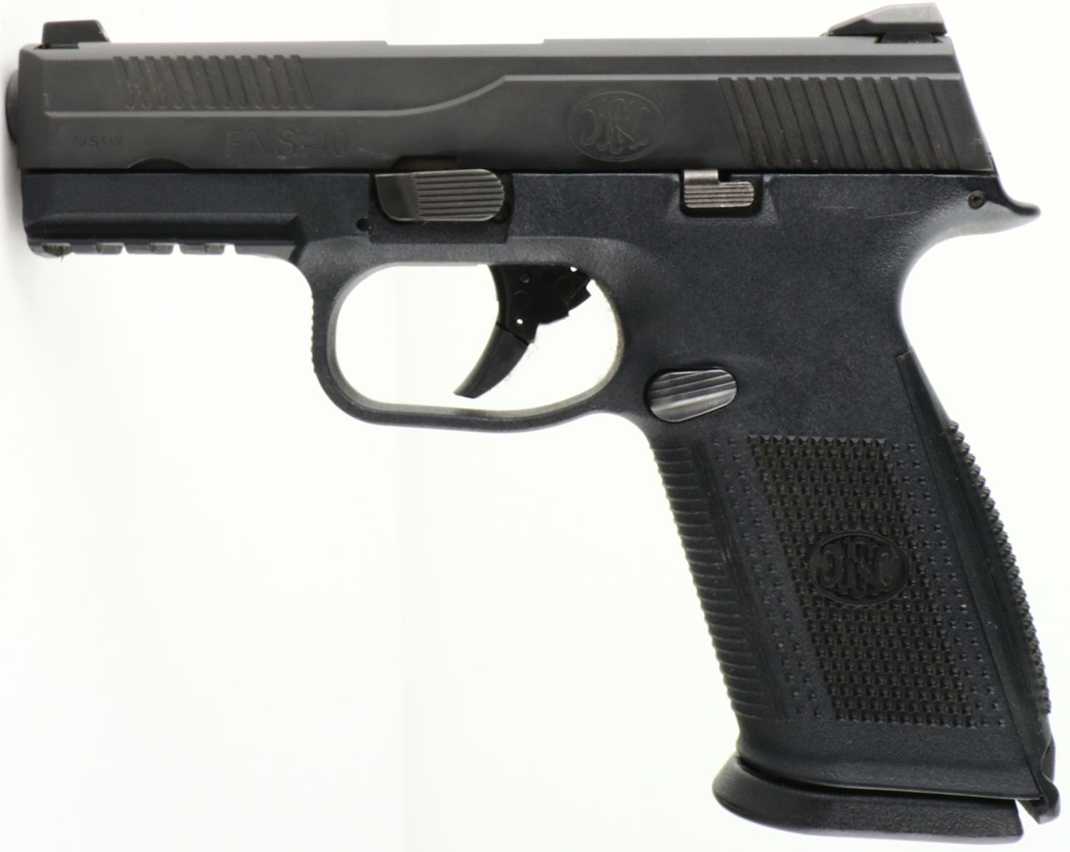FN, Model: FNS-40, Cal: .40 S&W, MFG: Modern, S/N: GKU0072410, Semi-Auto Pistol, 3 7/8'' barrel. The polymer, checkered FN logo frame is excellent with little to no wear. The black metal finish is excellent with almost no scratches or wear. Left side of slide is marked ''.40 S&W'', '' FNS-40'', & the FN logo, right side of slide is marked ''MADE IN USA'', ''FNH USA Fredericksburg VA.''. Bore is excellent. Slide holds a block front sight with white dot, & a deep U-notch rear sight with two white dots. Comes with one 14 Rd. mag. FFL Req. - Value: 200 to 400