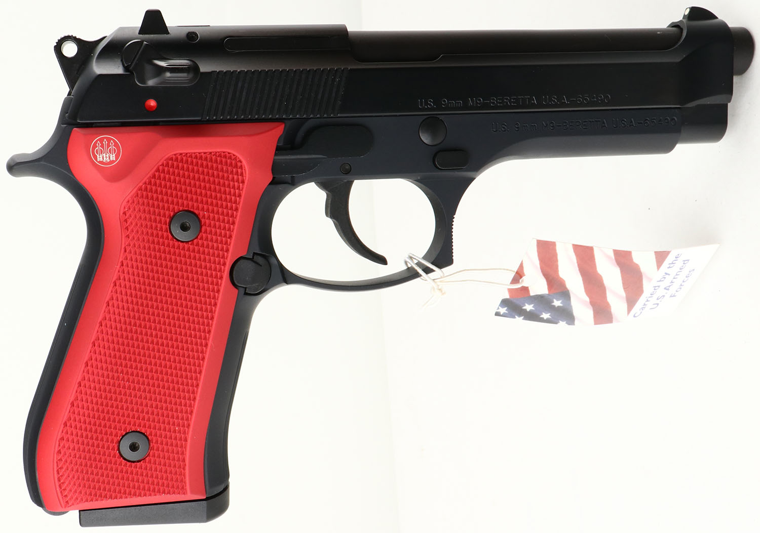 NEW CASED, Beretta, Model M9 U.S. MARINE CORPS, CAL: 9mm, MFG: Modern, SN: M9-123046, Semi Auto Pistol, 4 3/4'' barrel. The factory red aluminum grips are mint. The factory matte black finish is mint with US Flag & Marine logo on left side of receiver, white dot rear sight & single white dot front sight. Comes in factory hard case, with owners manual, brochure, extra black grips, & (3) 15rd mags. FFL Req. - Value: 700 to 1000