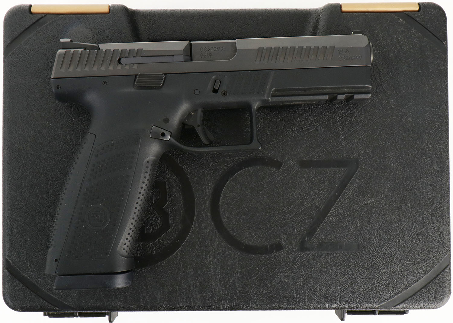 CASED, CZ, Model P-10 F, CAL: 9mm, MFG: Modern, SN: C840399, Semi Auto Pistol, 4 3/8'' barrel. The textured polymer grip frame is excellent. The factory matte black finish on the slide rates 99%. Bore is excellent & minty. Factory sights. Comes in factory hard case, with owners manual, cleaning rod, extra grip attachment, lock/key. FFL Req. - Value: 450 to 600