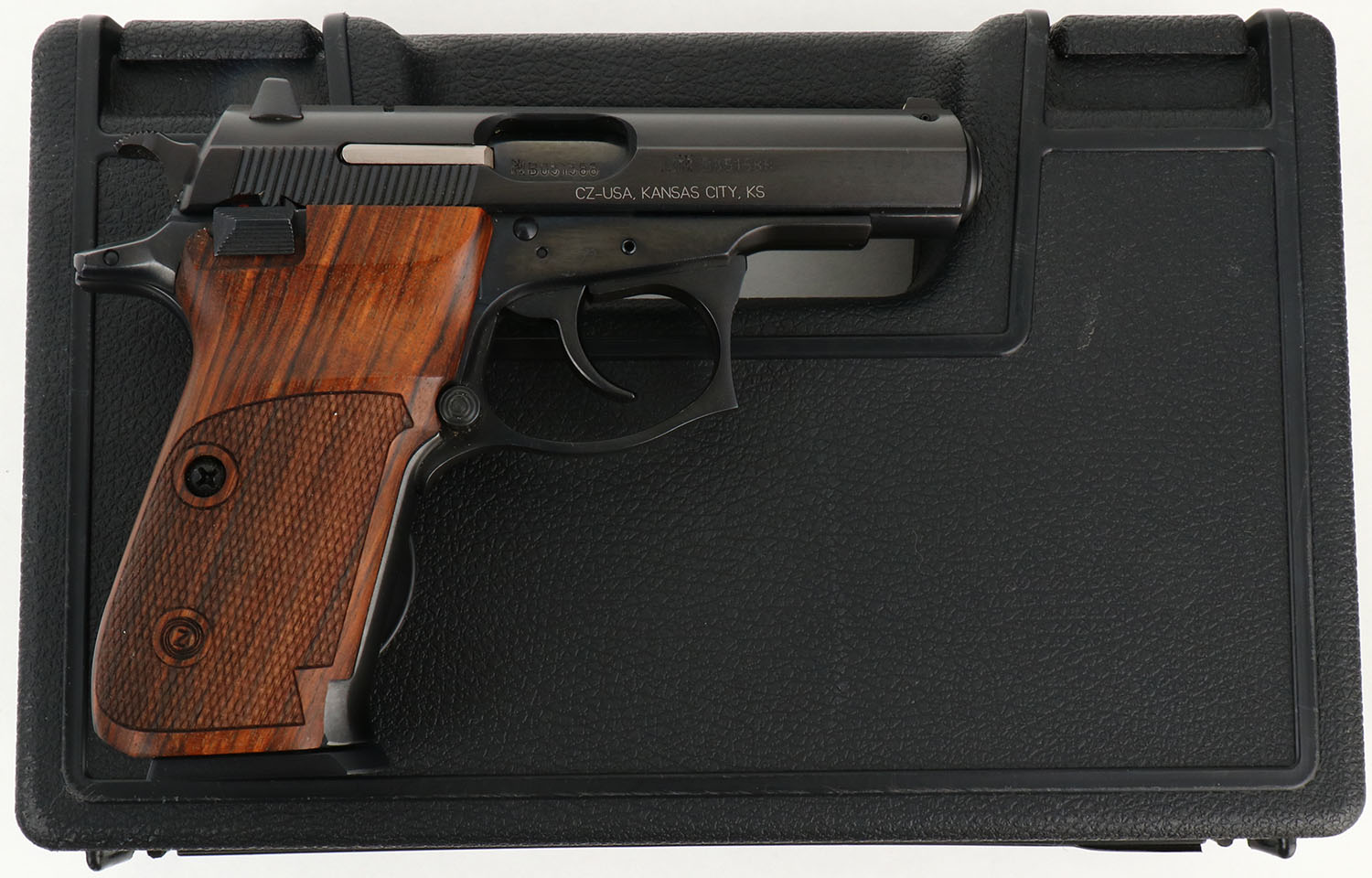 CASED, CZ, Model 83, CAL: 9mm Browning Court (.380), MFG: Modern, SN: B051588, Semi Auto Pistol, 3 3/4'' barrel. The CZ logo checkered wood grips are excellent. The factory metal blue finish on the frame & slide rates 99%+. Bore is excellent & minty. Factory sights. Comes in factory hard case, with owners manual, extra magazine & a set of checkered plastic grip panels. FFL Req. - Value: 400 to 800
