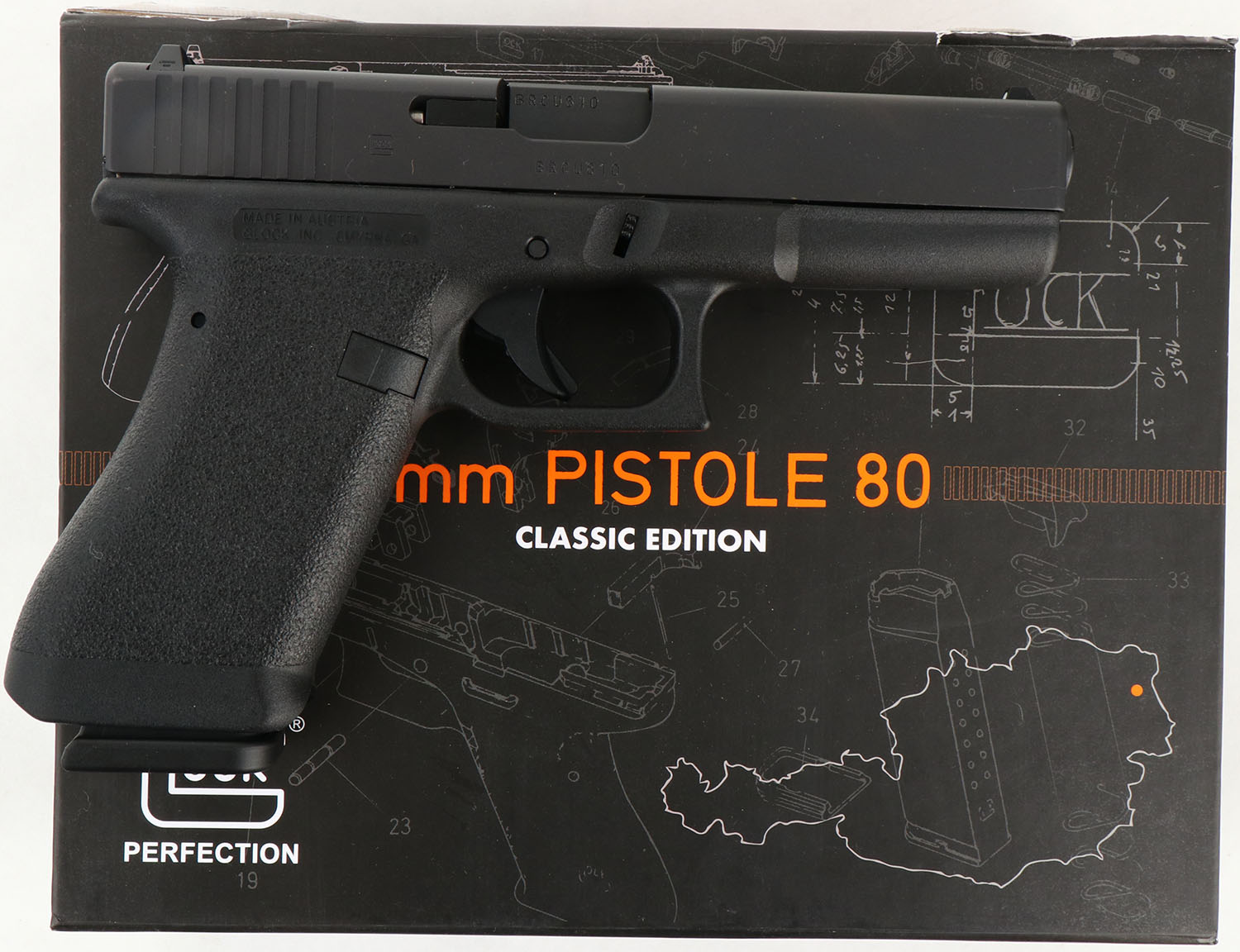 BOXED, Glock Perfection, Model P80 Classic Edition, CAL: 9mm, MFG: Modern, SN: BRCU810, Semi Auto Pistol, 4 3/8'' barrel. The textured polymer grip frame is excellent & minty. The factory matte black finish on the slide rates 99%+. Bore is mint. Factory sights. Comes in Glock Perfection box, with hard black case & included in the case is an extra mag, speed loader, related paperwork & cleaning brush. FFL Req. - Value: 500 to 700