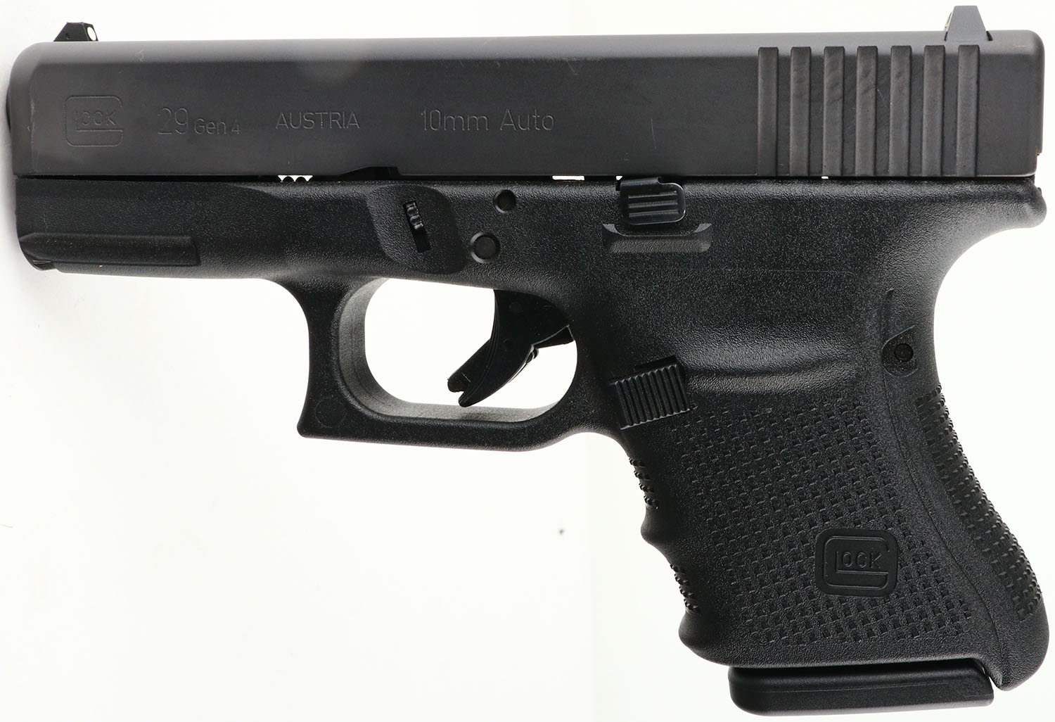 NEW CASED, Glock, Model 29 Gen 4, CAL: 10mm, MFG: Modern, Semi Auto Pistol, 3 3/4'' barrel. The textured polymer grip & frame are mint. The factory matte black finish is mint. Bore is mint. Factory square notch rear white sight & white dot front sight. Comes in factory hard case, with owners manual, lock/key, grip attachments, (3) 10rd mags & speed loader. NOS. FFL Req - Value: 500 to 700
