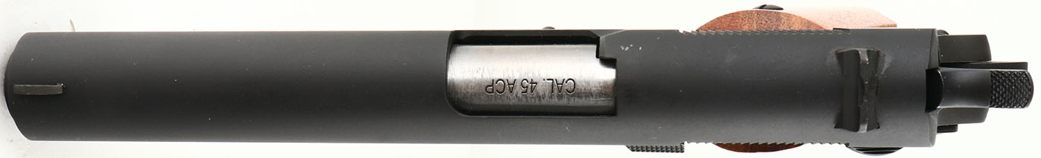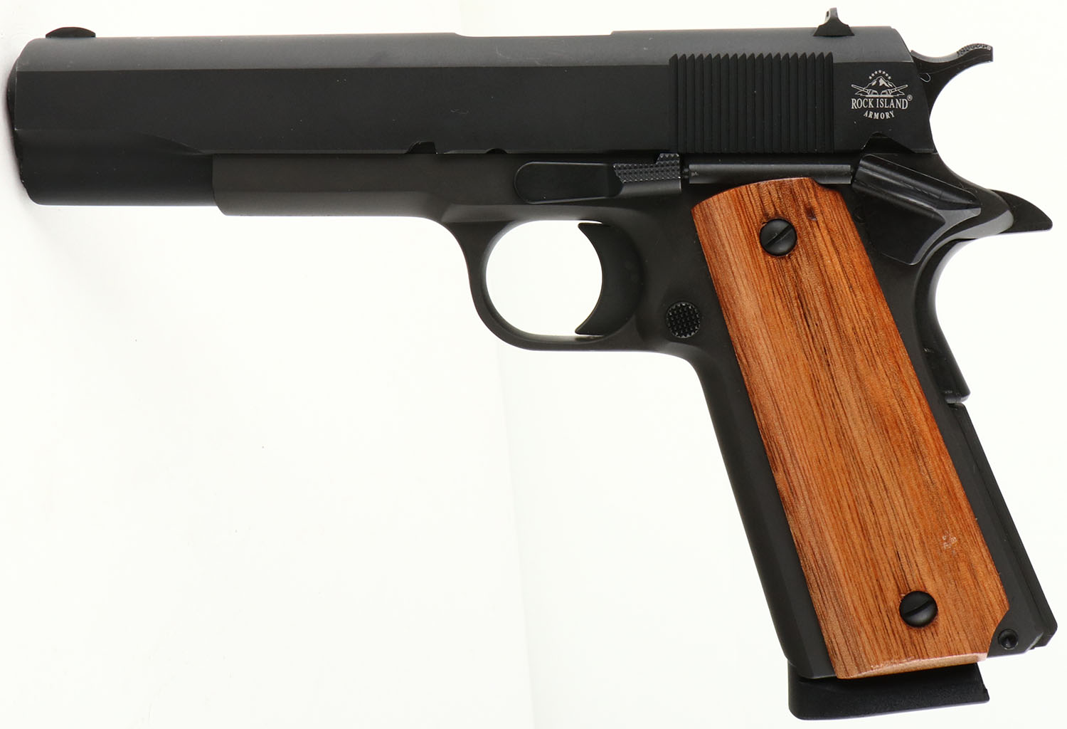 Rock Island Armory, Model: M1911 A1 FS, Cal: .45 ACP, MFG: Modern, S/N: RIA2600946, Semi-Auto Pistol, 4 7/8'' barrel. The original, smooth wood grips are excellent, with a couple of minor dings on left grip. The the original matte metal finish rates 98%, with a few minor scuffs. Right side of frame is marked with S/N, ''M1911 A1-FS'', bottom of frame is marked ''APINTL-PAHRUMP NV'', ''ACP PHILIPPINES'', right side of slide is marked with the Rock Island Armory Logo. Bore is excellent, with very minor wear from light use. Slide holds a blade front sight, with a square notch rear sight. Comes with one 8 Rd. mag. FFL Req. - Value: 400 to 600