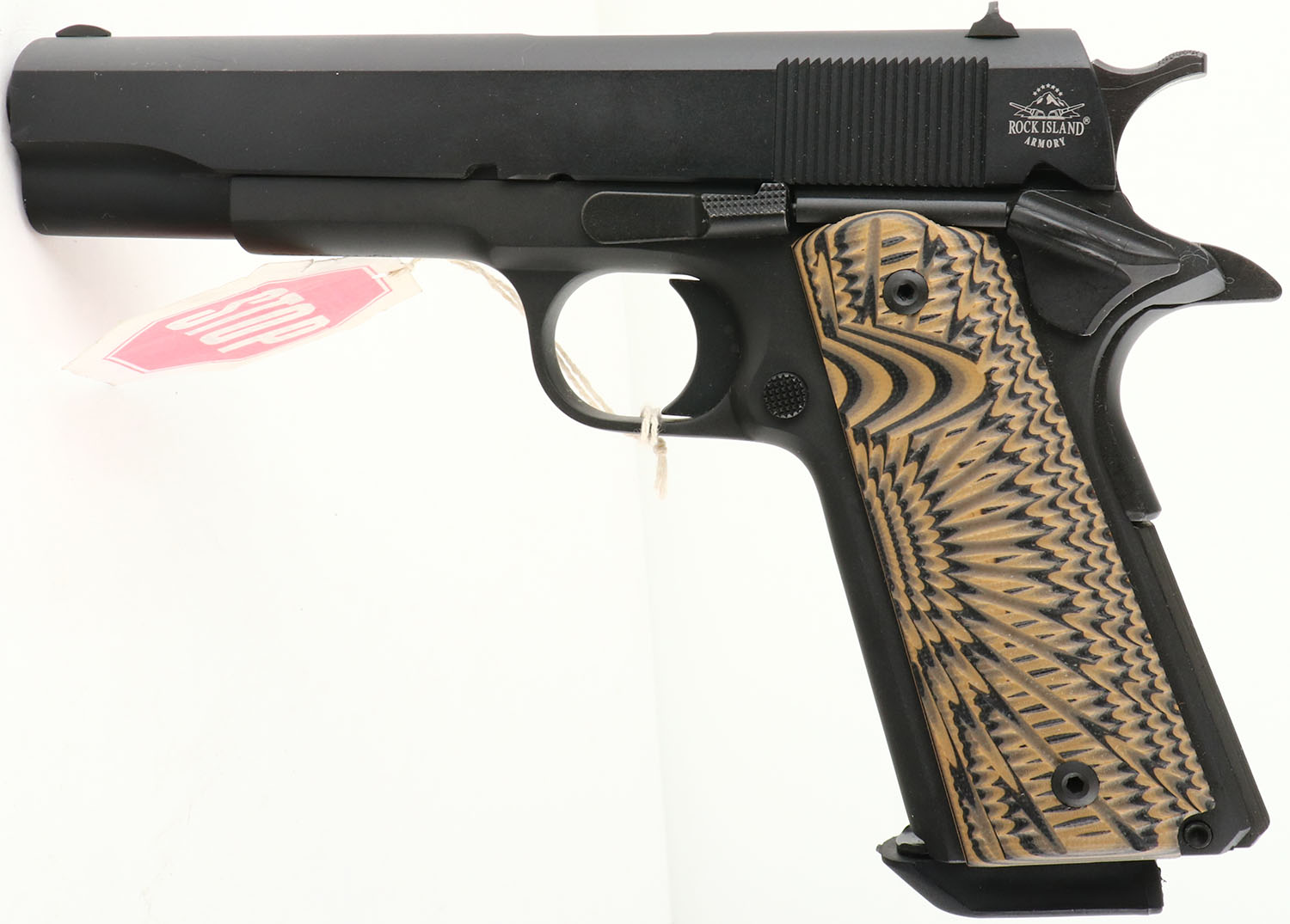 CASED, Rock Island, Model 1911A1-FS, CAL: 10mm, MFG: Modern, SN: RIA2445087, Semi Auto Pistol, 4 7/8'' barrel. The factory tan/black textured grips are excellent. The factory matte black finish rates 99%+ overall. Bore is excellent. Factory sights. Comes in factory hard case, with owners manual, test fire cartridge & lock/key. Gun store inventory, NOS. FFL Req. - Value: 600 to 800