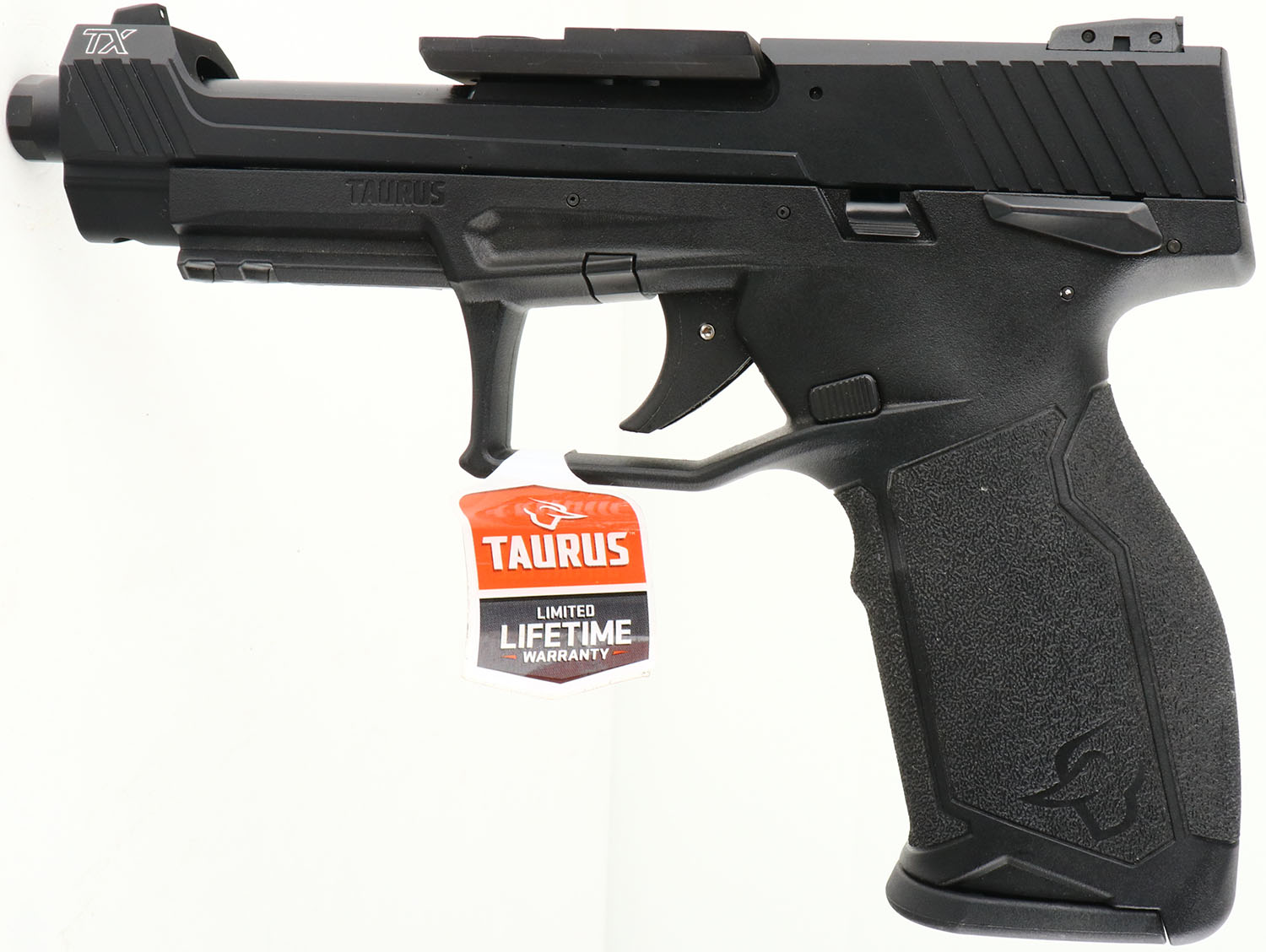 BOXED Taurus, Model TX22 Competition, Cal. .22 LR, Semi-Auto Pistol, Mfg. Modern, SN: 1PT449335, 5 1/4'' barrel, The original grips are excellent, Original mate blue finish is 100%, Bore is excellent, Has factory white dot sights front & black, BLACK OPTICS READY COMP. Original box, with paperwork, lock, speed loader & (2) extra 16 rd mag. Gun store inventory, NOS. FFL Req. - Value: 400 to 600