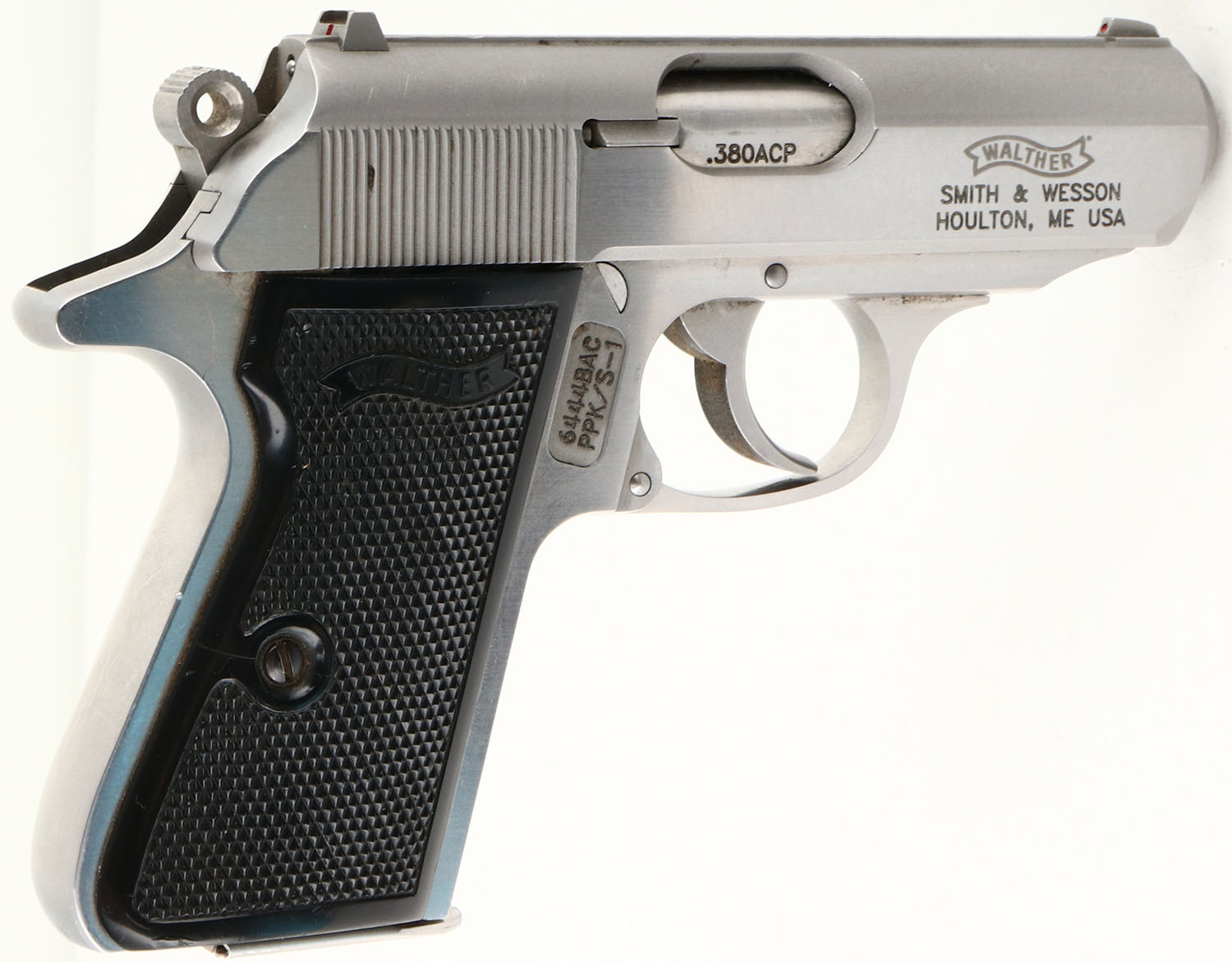 Walther/Smith & Wesson, Model: PPK/S, Cal: .380 ACP/9mm Kurz, MFG: Modern, S/N: 6444 BAC, Semi-auto pistol, 3 1/8'' barrel. The plastic, checkered, Walther banner grips are excellent, showing almost no wear. The stainless steel is excellent, with some tiny surface scratches. Right side of slide is marked with the ''WALTHER'' banner, ''SMITH & WESSON'', ''HOULTON, ME USA'', left side of slide is marked with the ''WALTHER'' banner, ''UNDER LICENSE OF'', ''Carl Walther Waffenfabrik Ulm/Do.'', ''Modell PPK/S Cal. 9mm Kurz/.380ACP'', right side of frame is marked with S/N & model #. Bore is excellent with minor wear from light use. Slide holds a squared off blade front sight with red dot, & a square notch rear sight with a red square. Comes with one original ''Walther'' marked 7 rd mag. FFL Req. - Value: 400 to 600