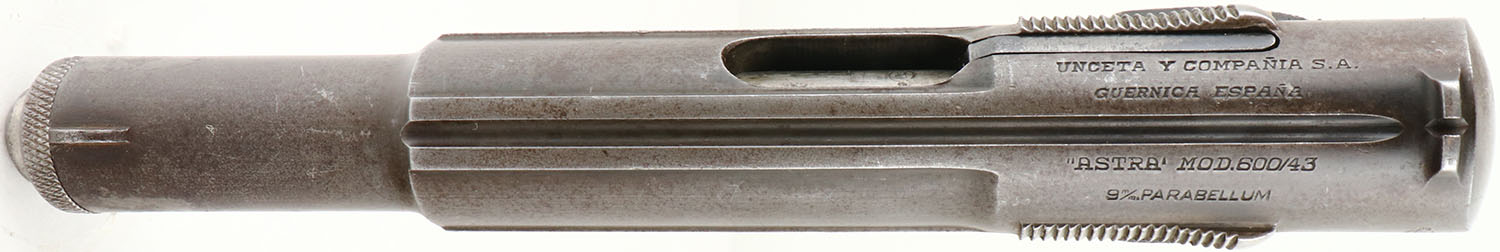 Astra, Model 600/43, CAL: 9mm Para, MFG: 1944, SN: 21355 Semi Auto Pistol, 5 1/4'' barrel. The original checkered walnut grips are excellent, with a couple minor scrapes & dings. The metal blue finish has worn to a mix of metal gray & a thin spotty layer of a brown patina. Bore is excellent. The slide has a fixed notch rear sight & blade front sight. SN matching Astra marked detachable mag, which is extremely rare to still retain the original SN matching mag. The front grip strap is property stamped ''LBPN'' (Landesbereitschaftspolizei Niederschsen), which was the postwar Lower Saxony Barracked Police. Missing Lanyard loop. In late 1943, examples of the newly designed Astra 600 were sent to Germany & were approved for issue to German armed forces, receiving the designation Pistole Astra 600/43. The Astra 600's that could not be delivered to the German government during World War II were then stored by the Spanish government. Small quantities of pistols were sold to Turkey, Portugal, Chile, & Costa Rica until 1951, when the remaining Astra 600's were sold to West Germany. Those pistols were extensively used by West German police forces until the late 1960's when Interarms purchased the remaining pistols for export to the United States civilian market. FFL or C&R Req. - Value: 250 to 450
