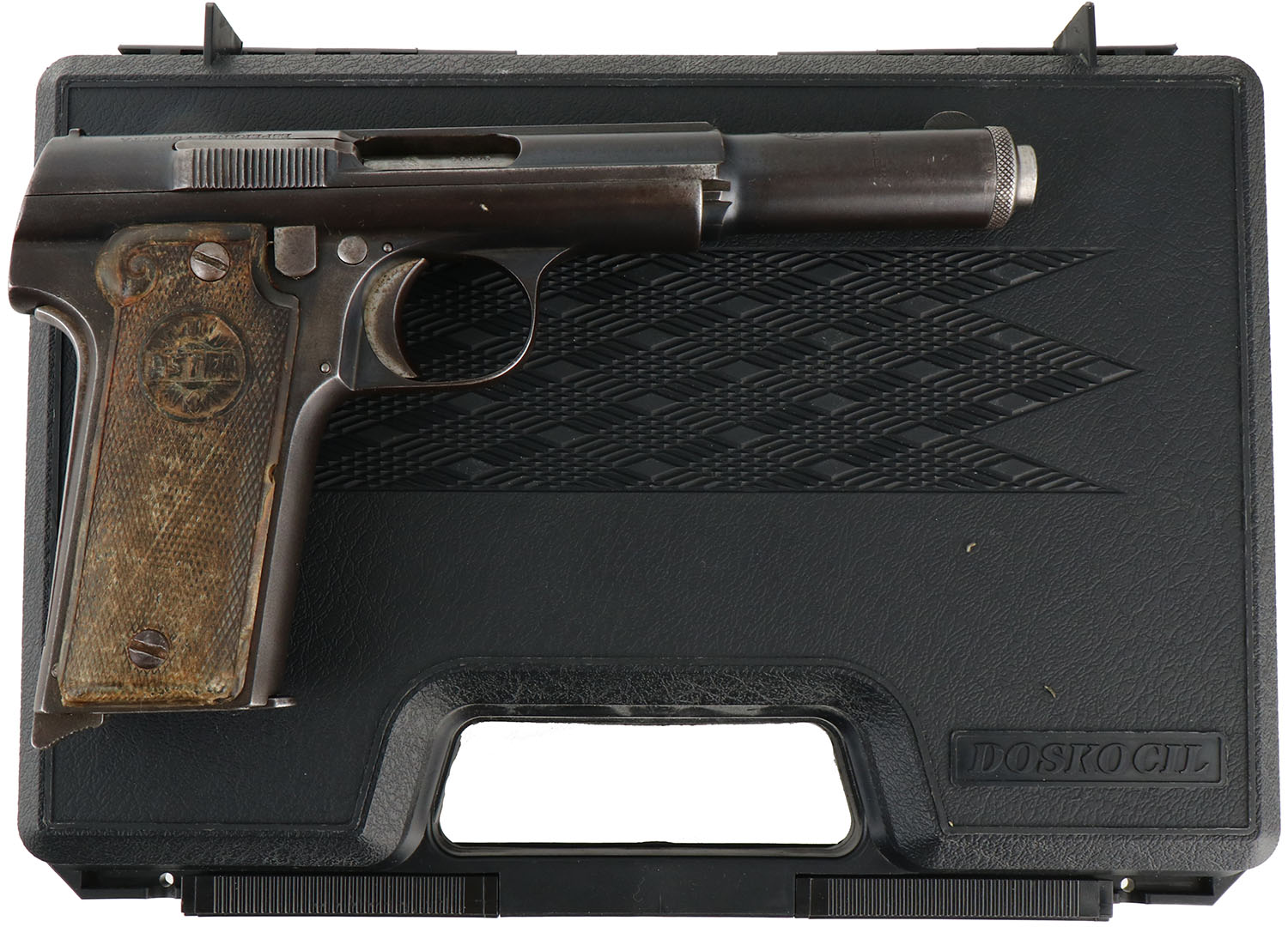 Astra, Model 1921/400, Chilean Navy Pistol, CAL: 9mm, MFG: 1921-50, SN: 36496, Semi Auto Pistol, 6'' barrel. This pistol was the standard issue sidearm in the Spanish Army during the Spanish Civil War & also saw service in Germany during World War II. Designed to be safe to fire with a simple blowback action unaided by any breech-locking devices. This pistol carries all the original markings & proofs. Additionally, the top of the barrel is marked ''MARINA DE CHILE'' under a star. The original Astra logo checkered grips are good, worn from use & have color fading, nicks, dings & multiple small edge cracks. The metal blue finish has 90% coverage of a mix of original blue & brown patina, with small areas of cleaned pitting. Most of the finish loss found on the front & back straps. Bore is excellent. The slide holds notch & blade sights. Comes with an aftermarket hard case that includes (3) mags & a cleaning rod. FFL or C&R Req. - Value: 200 to 400