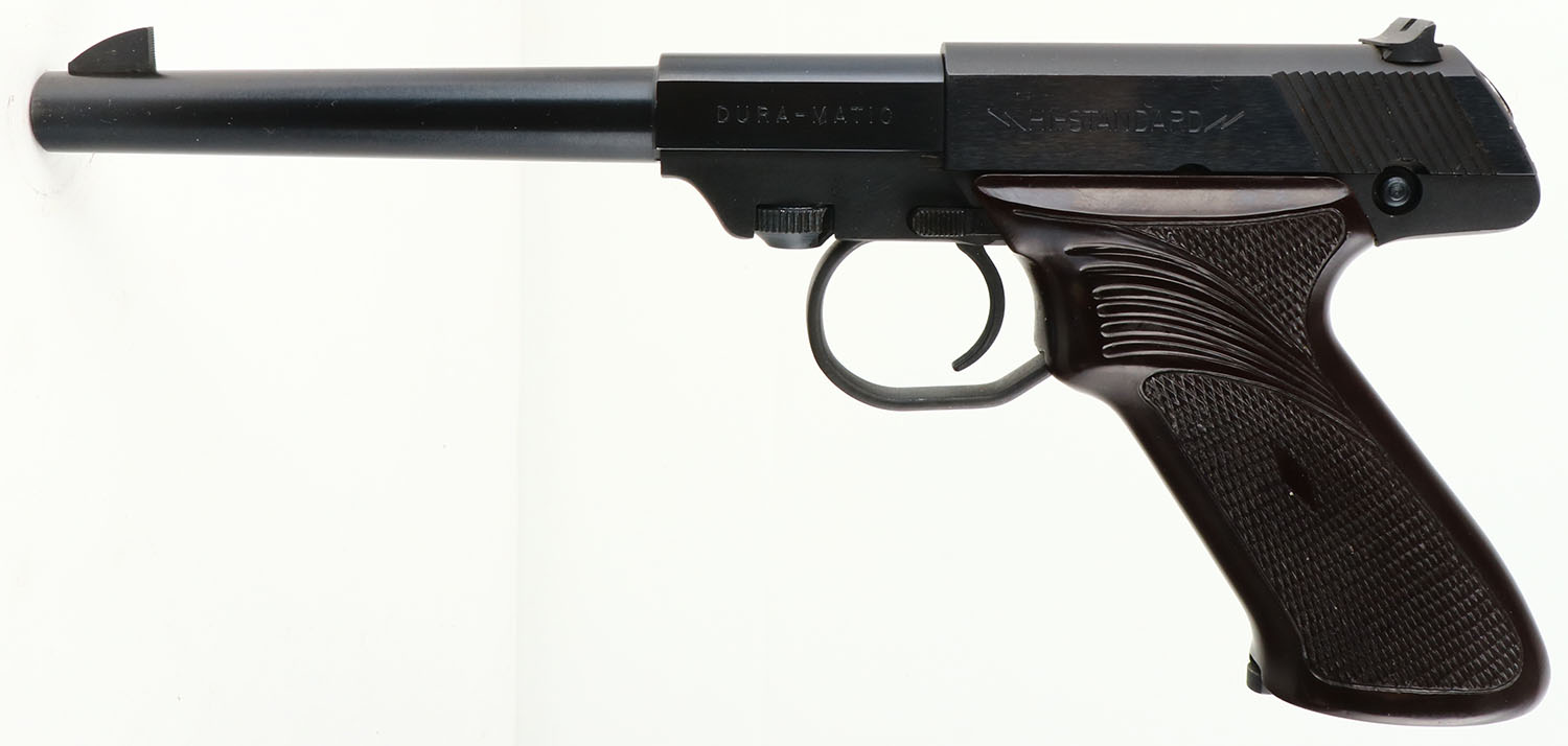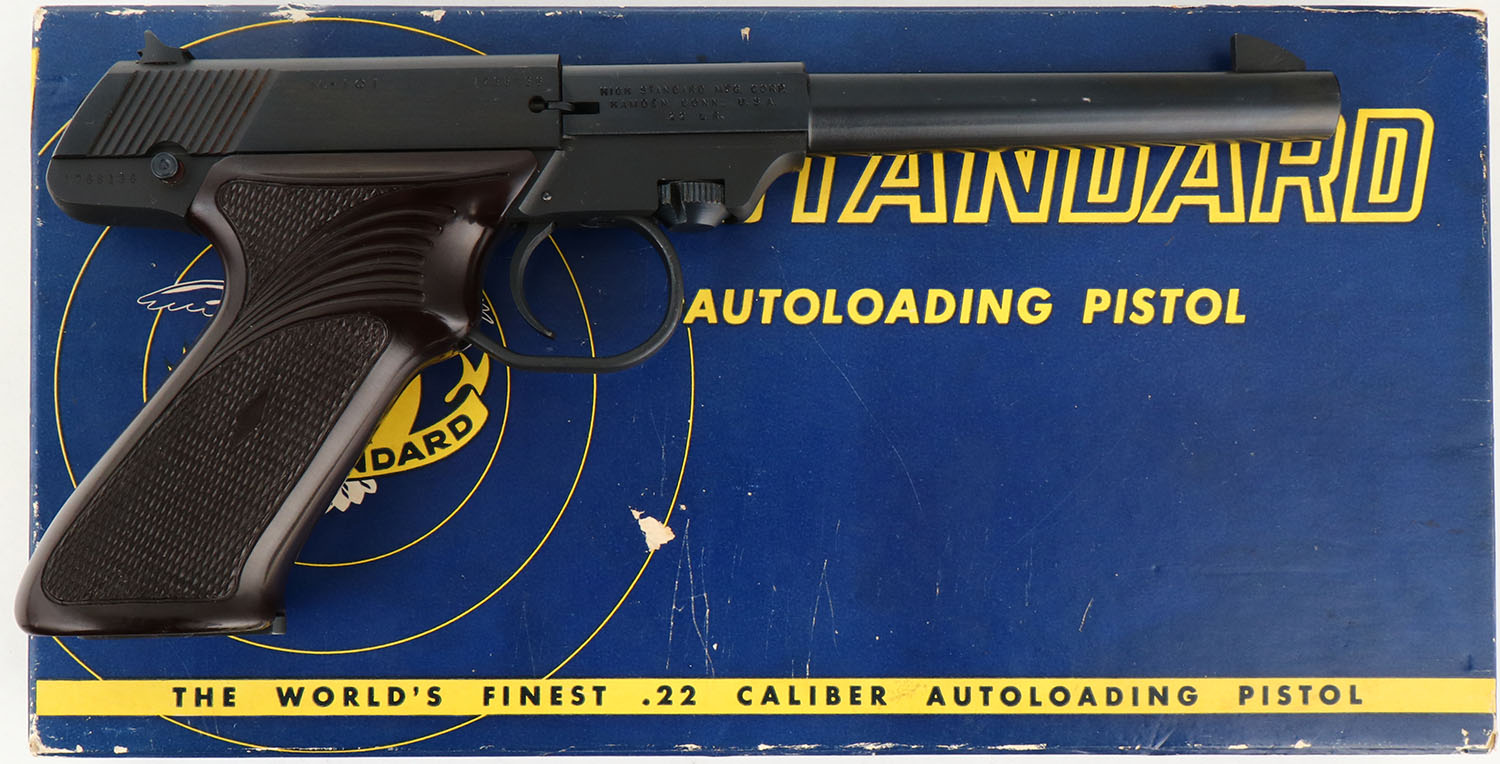 BOXED High Standard, Model M-101 Dura-Matic, CAL: 22 LR, MFG: 1966-67, SN: 1768136, Semi Auto Pistol, 6 1/2'' barrel. The checkered plastic grips are excellent, with light handling wear. The metal blue finish rates 98% overall, with a couple minor areas of speckling. Bore is excellent. The barrel holds a serrated blade front sight & the slide has a fixed notch rear sight. ''HI-STANDARD'' marked magazine, with green follower. Comes in original SN matching box, with all of the original paperwork. FFL or C&R Req. - Value: 300 to 600