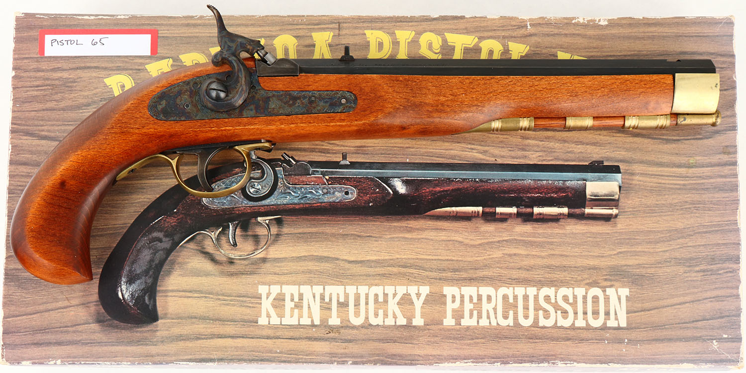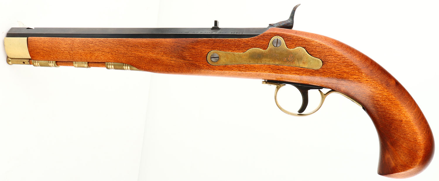 BOXED, Ultra-Hi, Replica Kentucky Pistol Kit (Model 7090K), Mfg. by Miroku in Japan, CAL: 45, MFG: Modern, SN: 12183, Percussion Muzzleloader Pistol, 9 1/8'' barrel. The one piece wood grip is excellent. The metal blue finish on the barrel rates 99%. The case-hardened side plate & hammer display vivid case-colors. The brass components have a thin aged patina, with some oxidization on the left side plate. Bore is excellent, with minor spotting at the muzzle. The barrel holds a fixed notch rear sight & open front dovetail. There is a brass front sight blank missing the bead in the box. Ramrod present. Comes in original box, with tool, extra body screw & documents. Black Powder, No FFL Req. - Value: 100 to 200