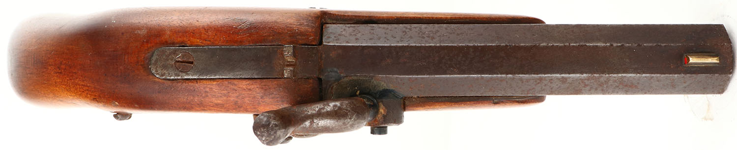 Unknown, Percussion Pistol, CAL: .42 cal, MFG: unknown, SN: NSN, Single Shot Black Powder Muzzleloader Pistol, 7 1/2'' octagon barrel. The original wood stock is excellent, with inlaid ebony at the forend tip. There are few tiny contusions to the original finish. The metal finish has fully toned to a brown patina, with rust speckling. Bore has good rifling, but with lots of brown rust pitting. The barrel holds a fixed notch rear sight & small blade front sight. All appears to function properly. Black Powder. No FFL Req. - Value: 50 to 200