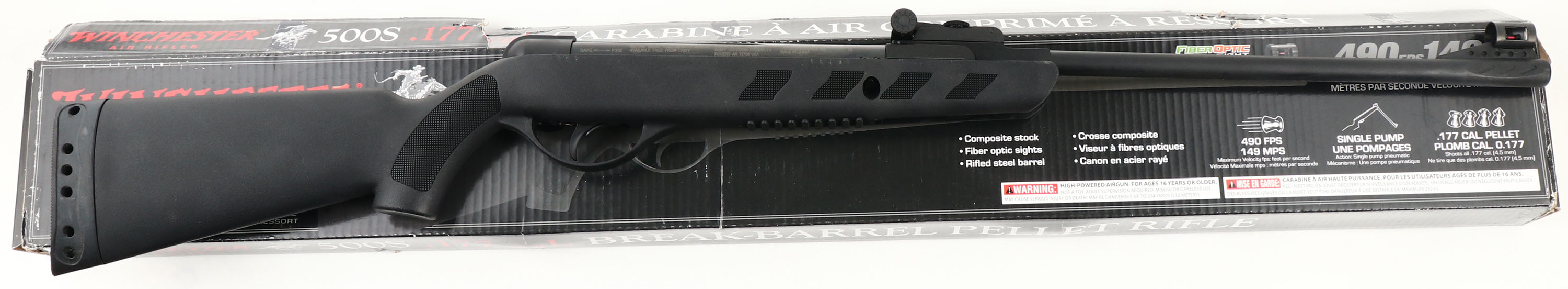 Winchester, Model 500S, .177 Caliber Pellet Rifle, Single Pump Break-Barrel, 500 FPS, 17 5/8'' Barrel, Black Synthetic Stock, Fiber-optic adjustable rear sights & hooded front sight post, bore is excellent, comes in original box. Grade: Excellent ++ - Value: 50 to 150