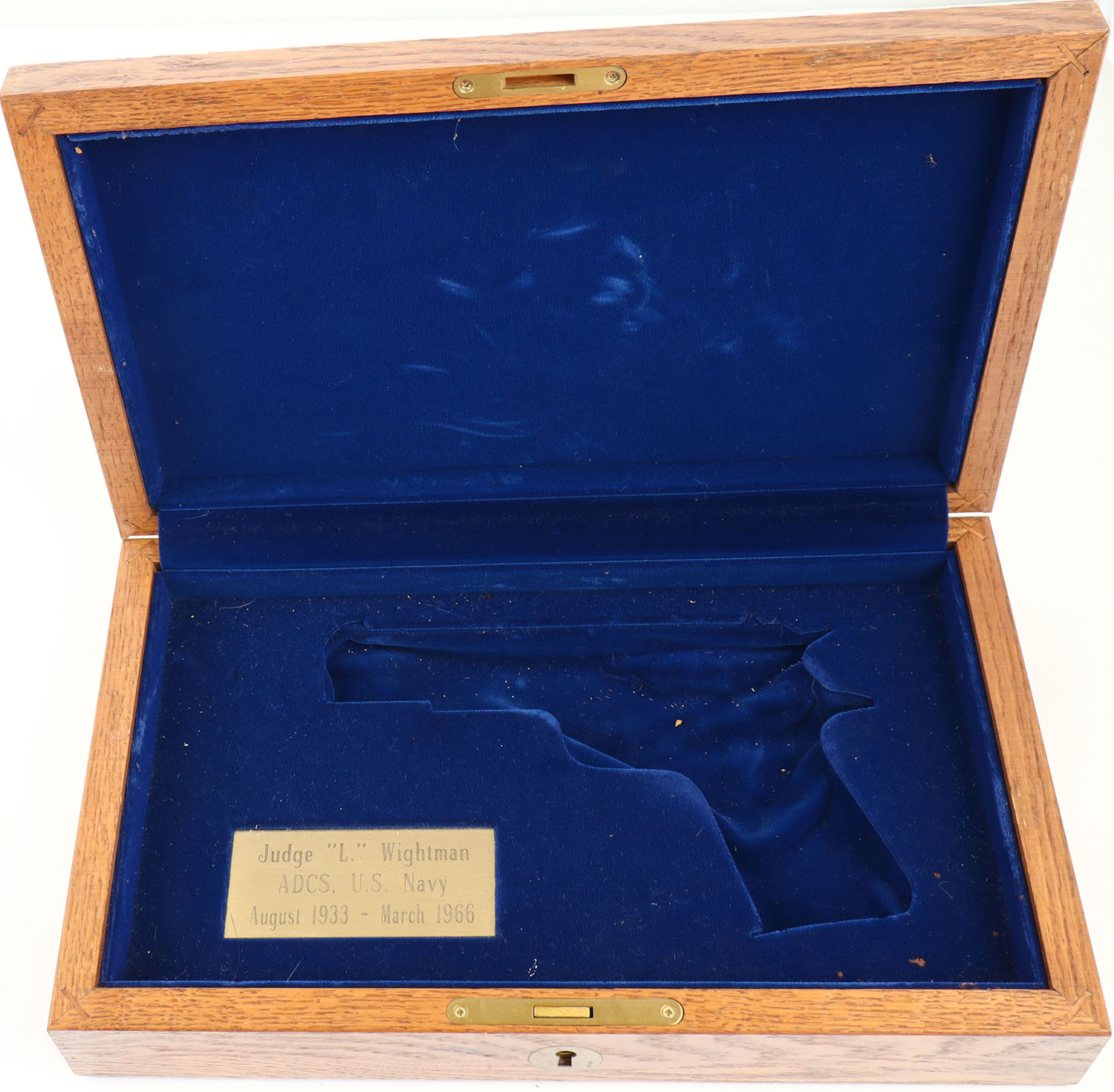 Empty wood pistol case with navy logo on top, inside has a brass plaque marked ''JUDGE ''L'' WIGHTMAN ADCS, U.S. NAVY AUGUST 1933 - MARCH 1966:, 14'' long. Grade: Very Good ++ - Value: 10 to 60