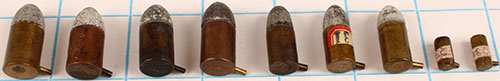 Lot of 9 Pinfires. (2) 5mm: Blanks (1 unk & 1 by Eley) . (3) 9mm ball: (2) by Eley, (1) by Hirtenberg-sunburst. (4) 12mm ball: (2) by Braun & Bloem, (1) by Sellier Bellot, (1) NHS w/ brass case. Grade: Excellent - Value: 30 to 50