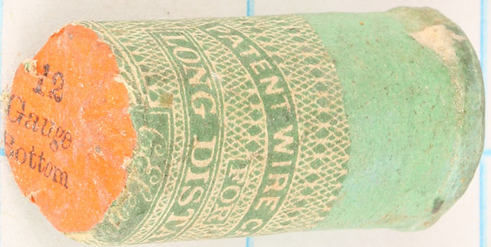 Early Eley's wire and concentrator shot loads. The Eley Brothers began designing shot in the 1820s in London and the company is still in business today and located in Birmingham. Civil Wire Paper wrapped Eley 12 gauge wire shot shell. Base of the cartridge is marked: 12 / GAUGE on an orange tag. Grade: Very Good ++ - Value: 10 to 60