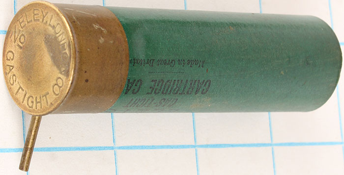 H/S= ''ELEY-LONDON No 8 Gastight'' 3 3/16'' OAL. Empty pinfire, green paper case. Grade: Very Good ++ - Value: 6 to 30