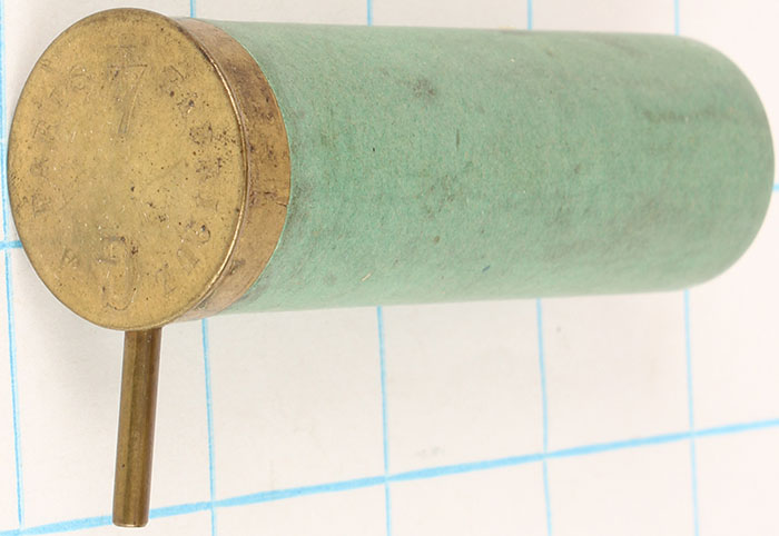 H/S= ''Fabrioue Paris 4 ga'' 3 3/16'' OAL. Loaded pinfire, green paper case. Grade: Excellent - Value: 10 to 50