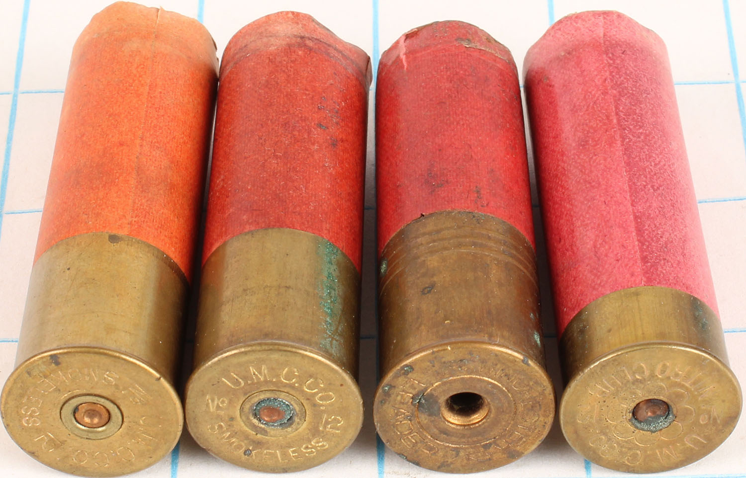 Lot of 4 (2) U.M.C. smokeless (1) U.M.C.CO. NITRO CLUB (1) Winchester Leader, 12 ga, empties, fired, red paper cases. Grade: Very Good + - Value: 6 to 30