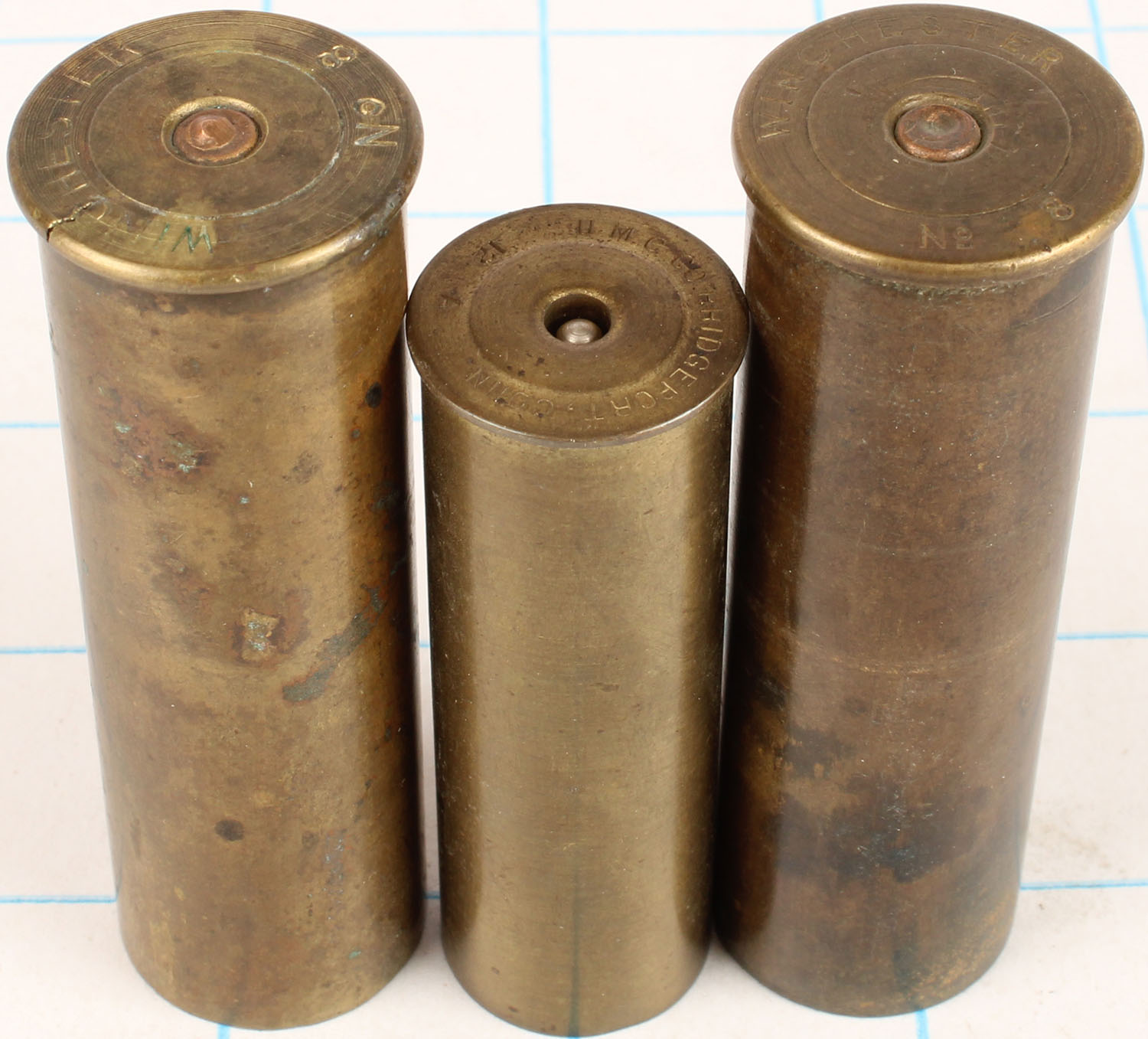Lot of 3, mixed H/S, mixed gauges, empty brass shotshells. Grade: Very Good + - Value: 6 to 30