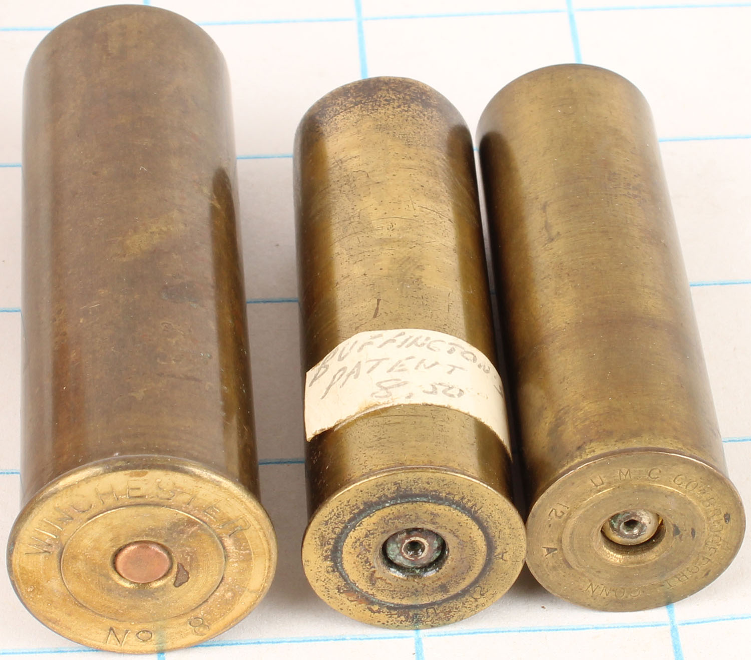 | Lot of 3 empty brass shotshells, mixed H/S, mixed gauges. Grade...