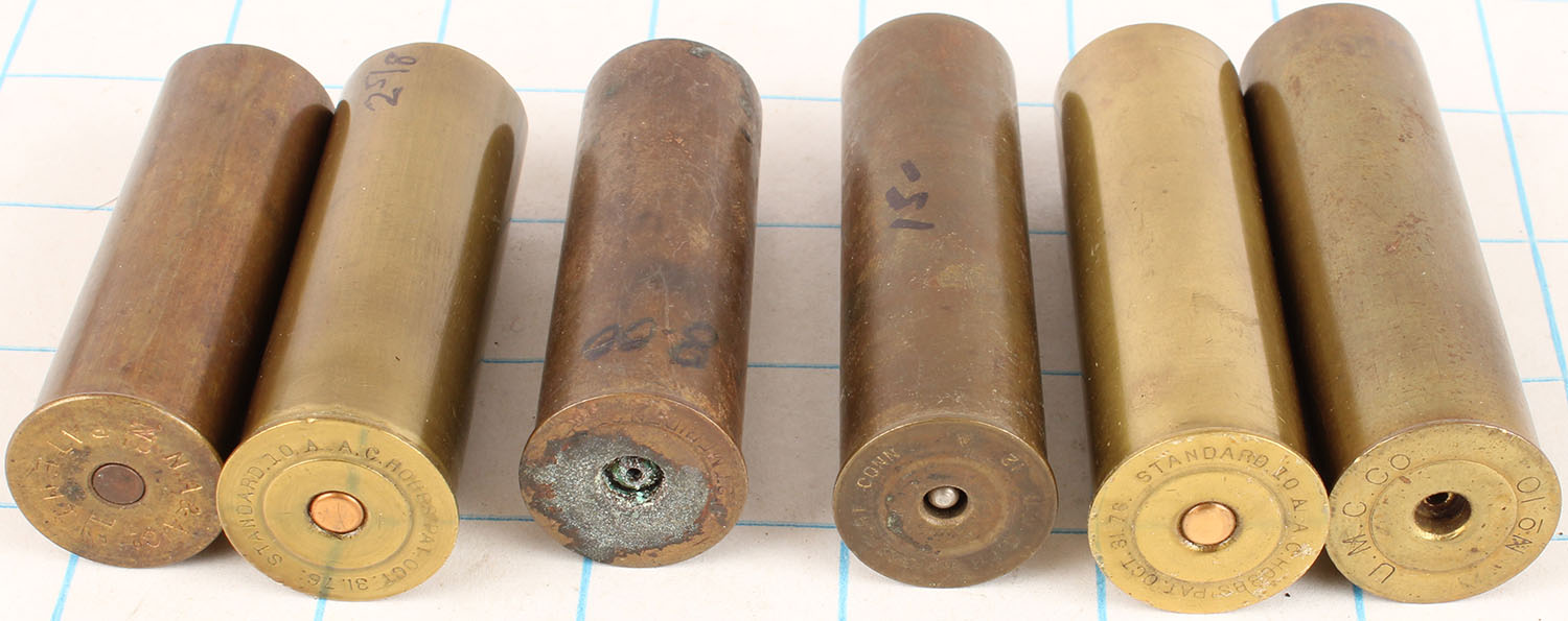 | Lot of 6 empty brass shotshells, mixed H/S, mixed gauges. Grade...