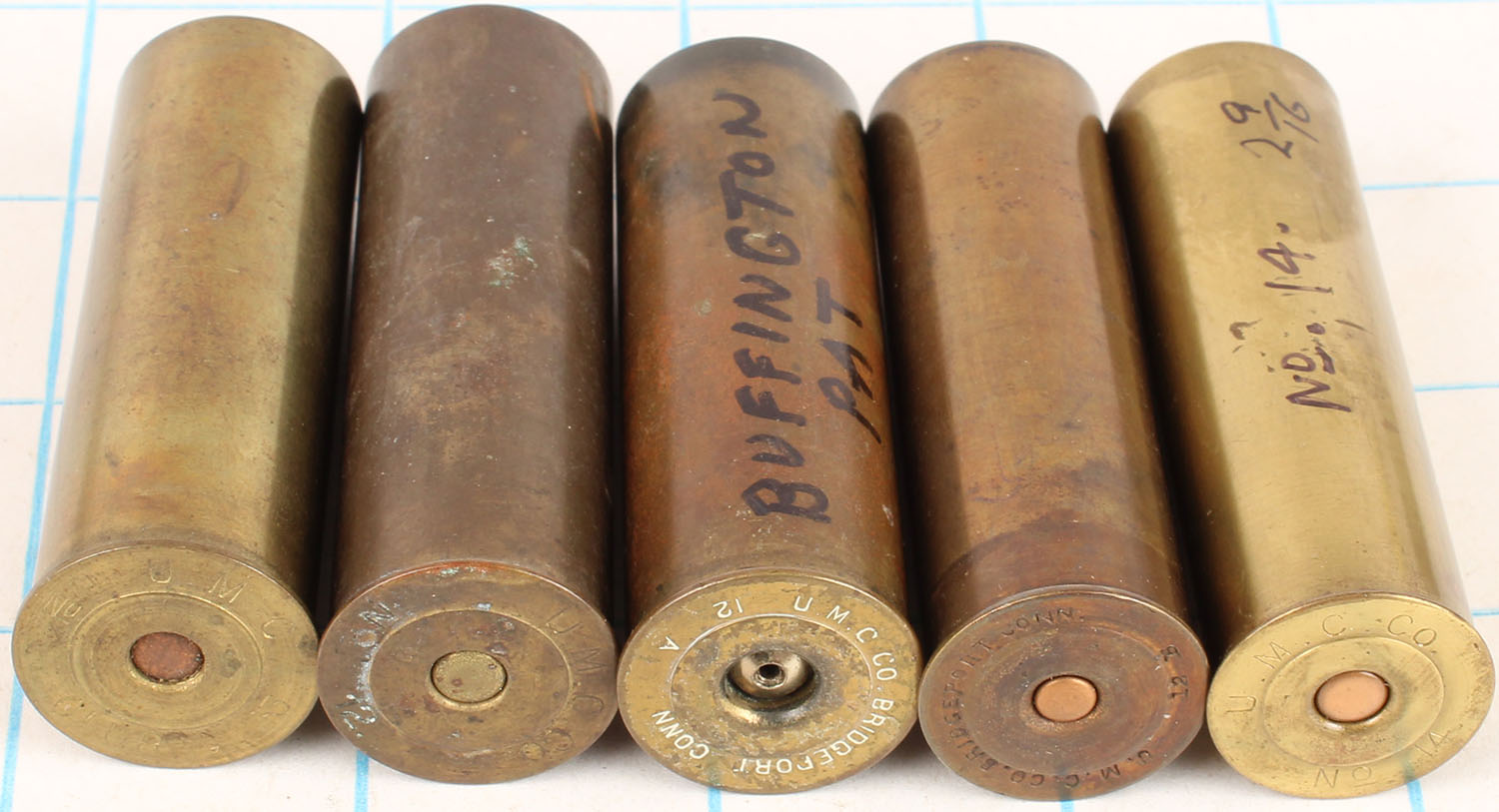 | Lot of 5 empty brass shotshells, mixed H/S, mixed gauges. Grade...