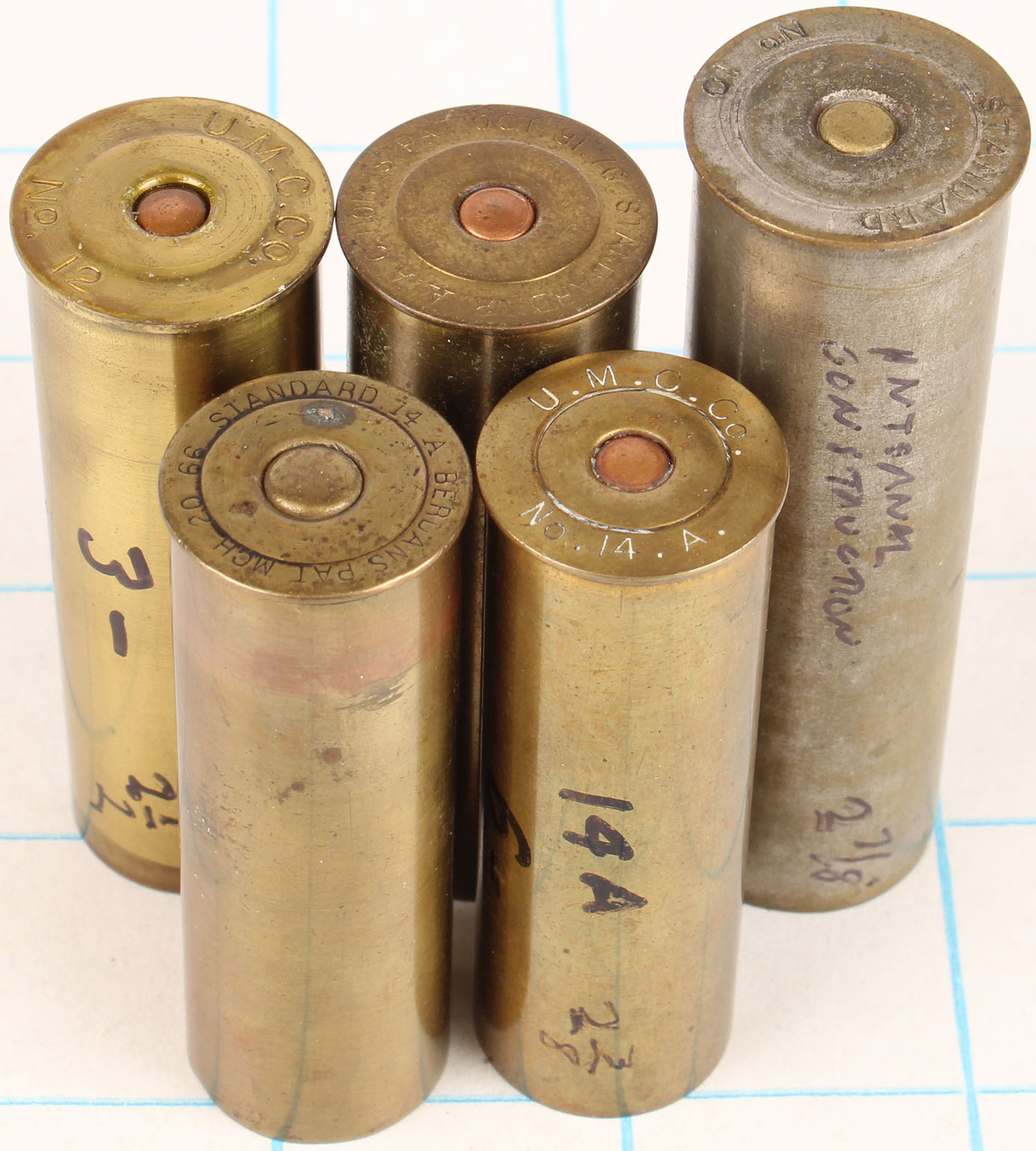 | Lot of 5 empty brass shotshells, mixed H/S, mixed gauges. Grade...