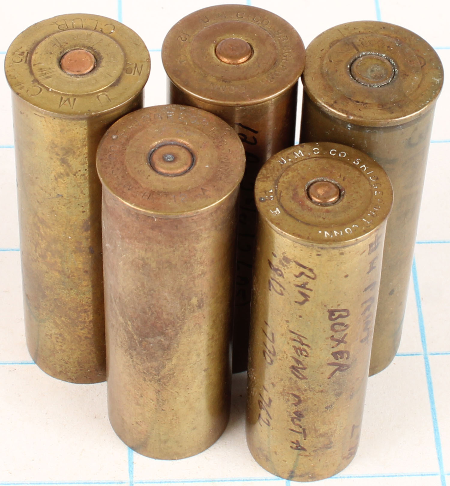 | Lot of 5 empty brass shotshells, mixed H/S, 12ga. Grade: Very G...