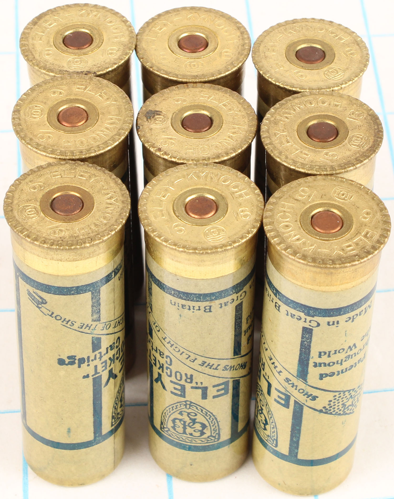 Lot of 9 loaded paper shotshells, ELEY KYNOCH Rocket 16ga, 2 3/8'' OAL. Grade: Excellent - Value: 6 to 30