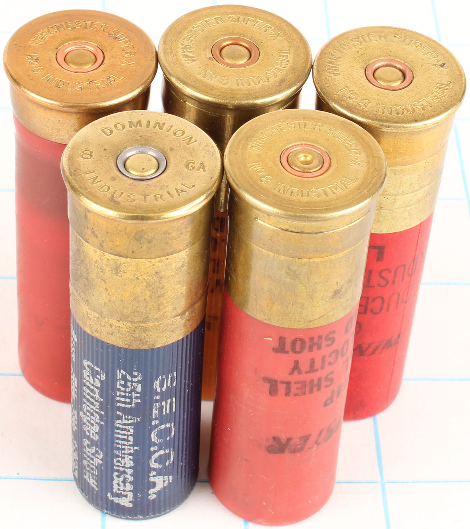 | Lot of 5 loaded shotshells, mixed H/S, 8ga, 3'' OAL. Grade: V...
