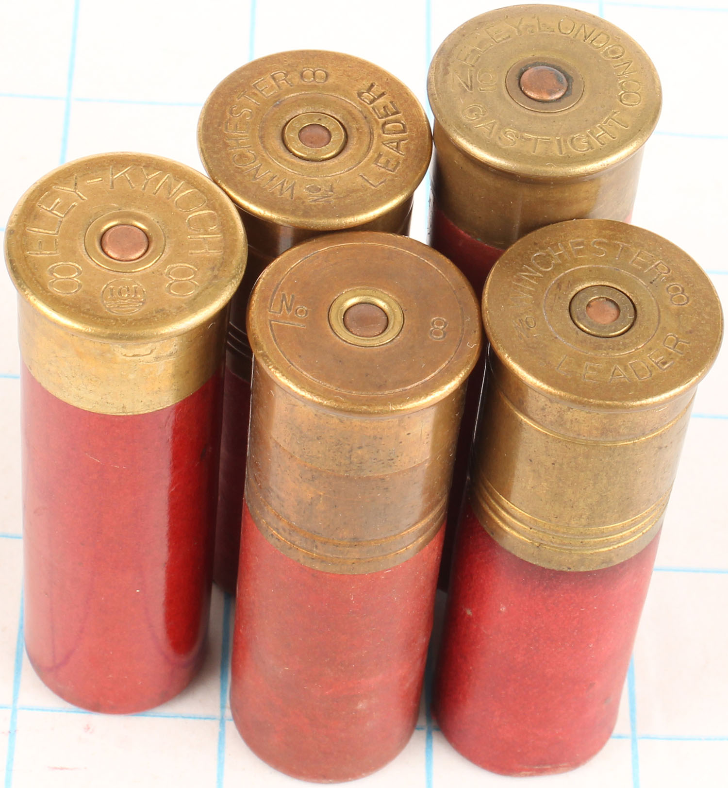 | Lot of 5 loaded red paper shotshells, mixed H/S, 8ga. Grade: Ve...