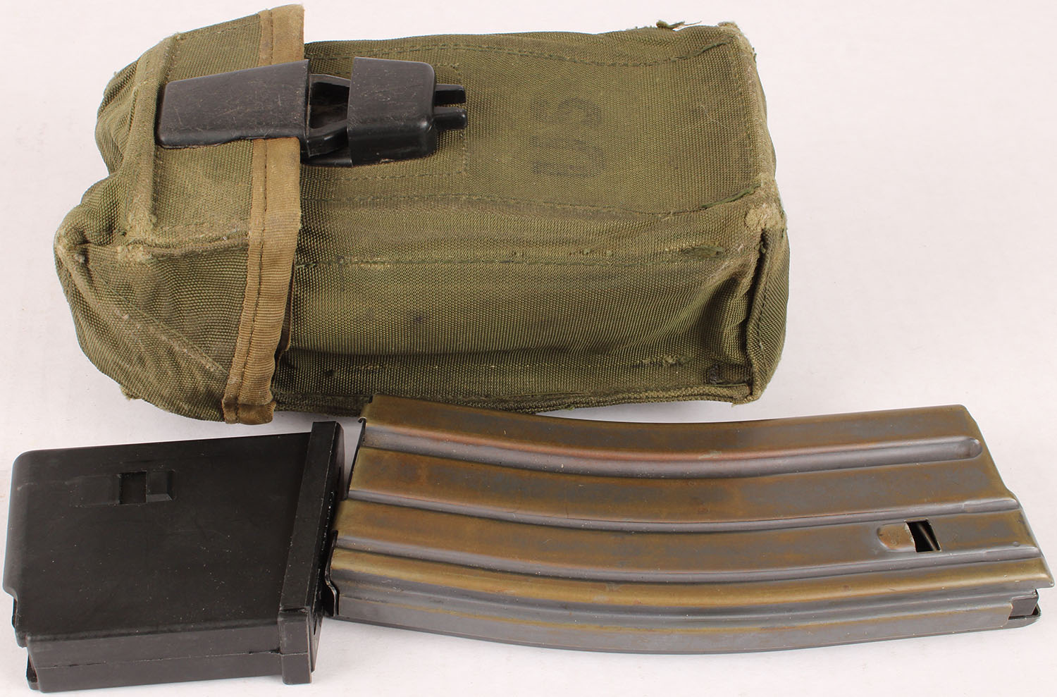 US M1967 30 Rd. M16 Mag pouch, missing side straps, no makers mark, comes with one 30 Rd. AR mag & one 10 Rd. AR mag. Grade: Very Good - Value: 10 to 40