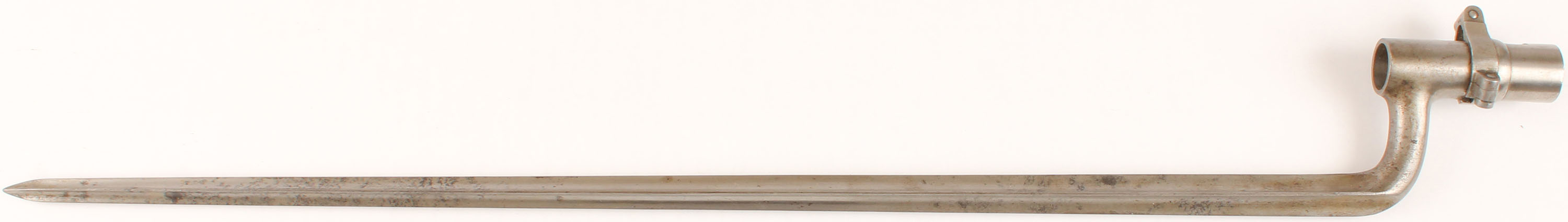 Dutch, 1871 Second pattern bayonet, right side of neck is marked with a ''V'' in a circle, Crown over ''N'', left side of neck is marked with a Crown over ''H'', socket is marked ''M 728'', blade has light cleaned pitting & gray patina. Grade: Very Good ++ - Value: 40 to 100